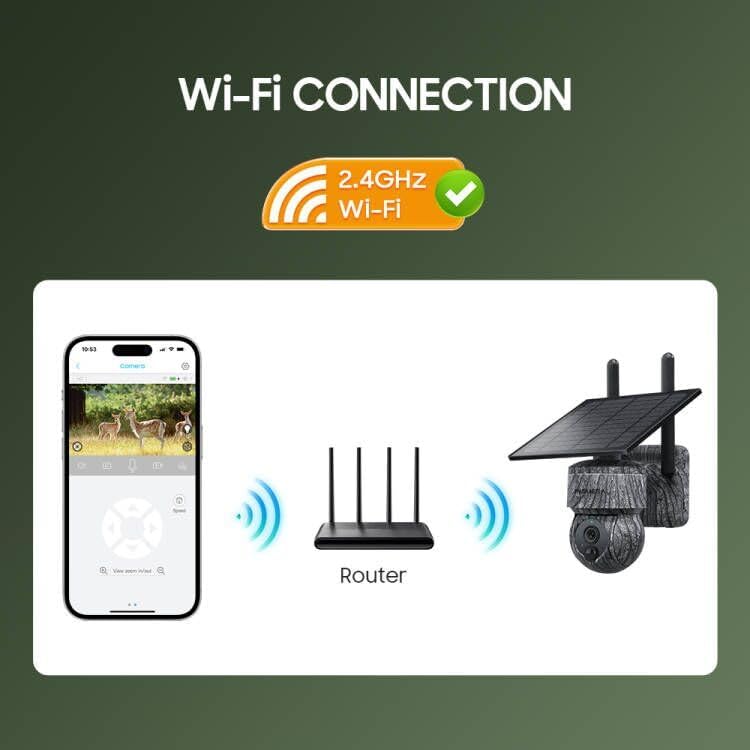 【100% Wire-Free & Solar Powered】Solar camera with 7800mAh rechargeable battery(include) stays fully-charged with Solar Panel. No need to remove camera to charge. The 5dbi dual antenna ensures that solar security camera has stable network reception, and quickly connects to 2.4Ghz WiFi from a longer distance.