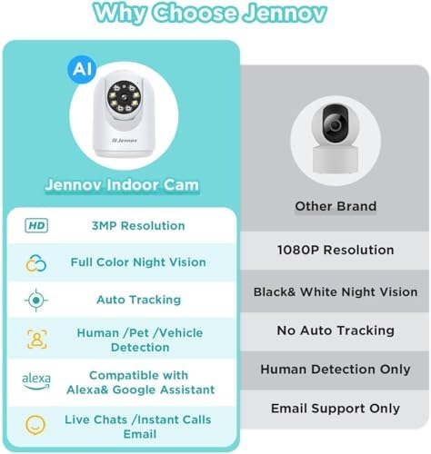 ✅【Crystal Clear 2K Video & Color Night Vision】- Jennov 3MP/2K wifi indoor camera provides high-quality video and recording with a 355° horizontal and 90° vertical rotation range, ensuring every corner of your home is covered. The advanced color night vision of indoor camera allows you to monitor your baby or pet clearly even in low-light conditions.
