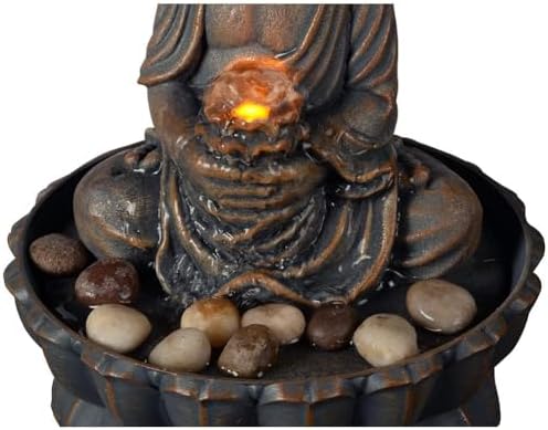 Exquisite hand-carved finish: Every detail of the carving can be seen from the pretty sitting buddha fountain, water flows through them, and there is a yellow reflective lighting, creates a tranquil atmosphere, soothe your stress and feel relaxed.