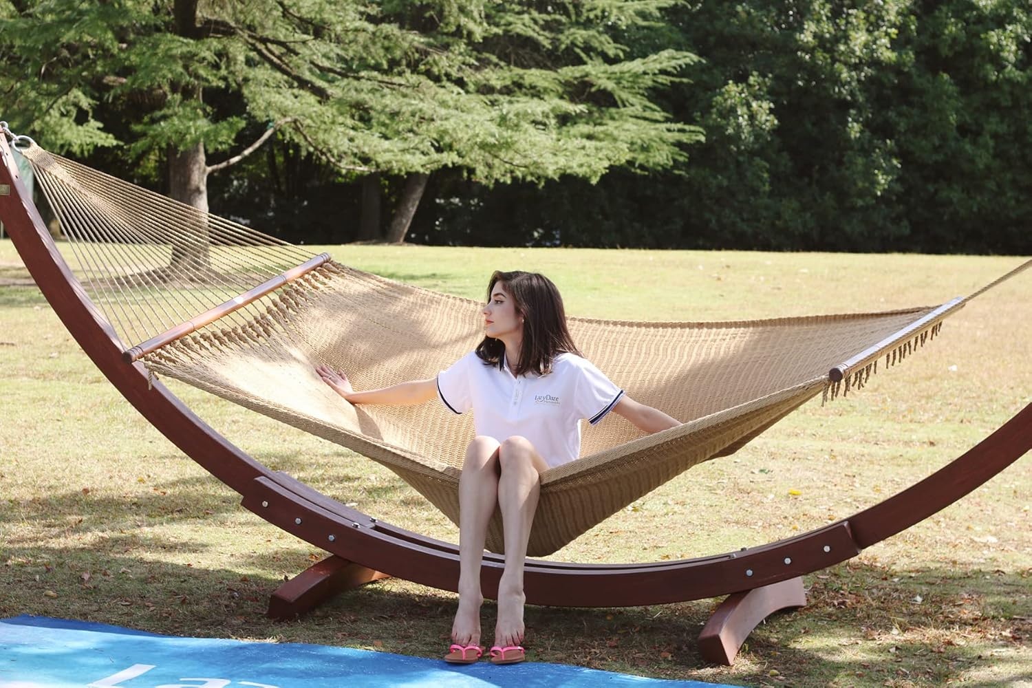 Lazy Daze 10 FT Double 2 Person Caribbean Rope Hammock, Hand Woven Polyester Hammock with Spreader Bars, Extra Large Outside Outdoor Backyard Patio Poolside Hammock, 450 LBS Capacity, Tan