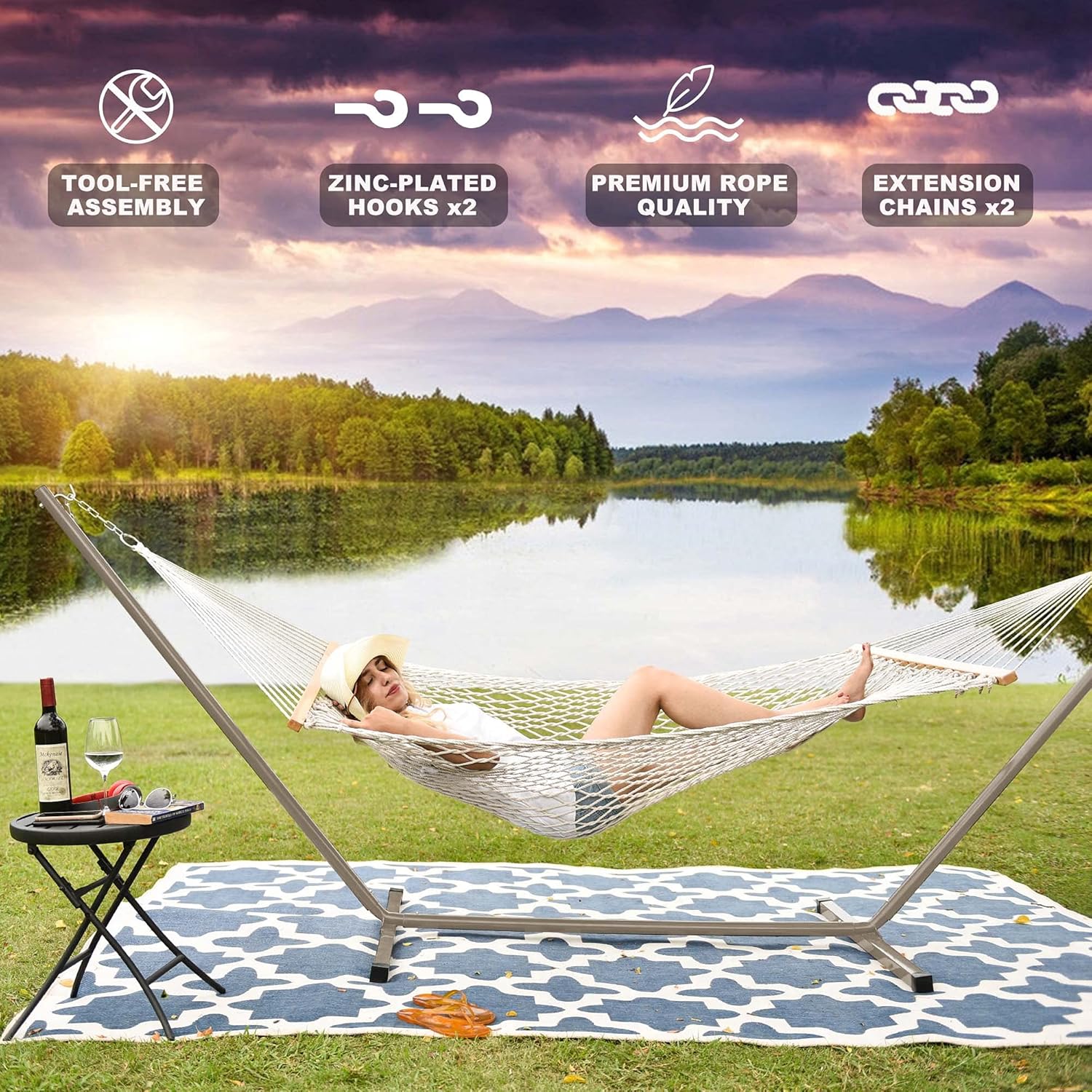✅【Heavy Duty Hammock Stand】No damage to trees. This 12 ft double hammock stand is made of powder coated heavy-duty steel for durability and stability. It can be assembled in minutes without any tools and can be easily disassembled, making it a portable hammock.