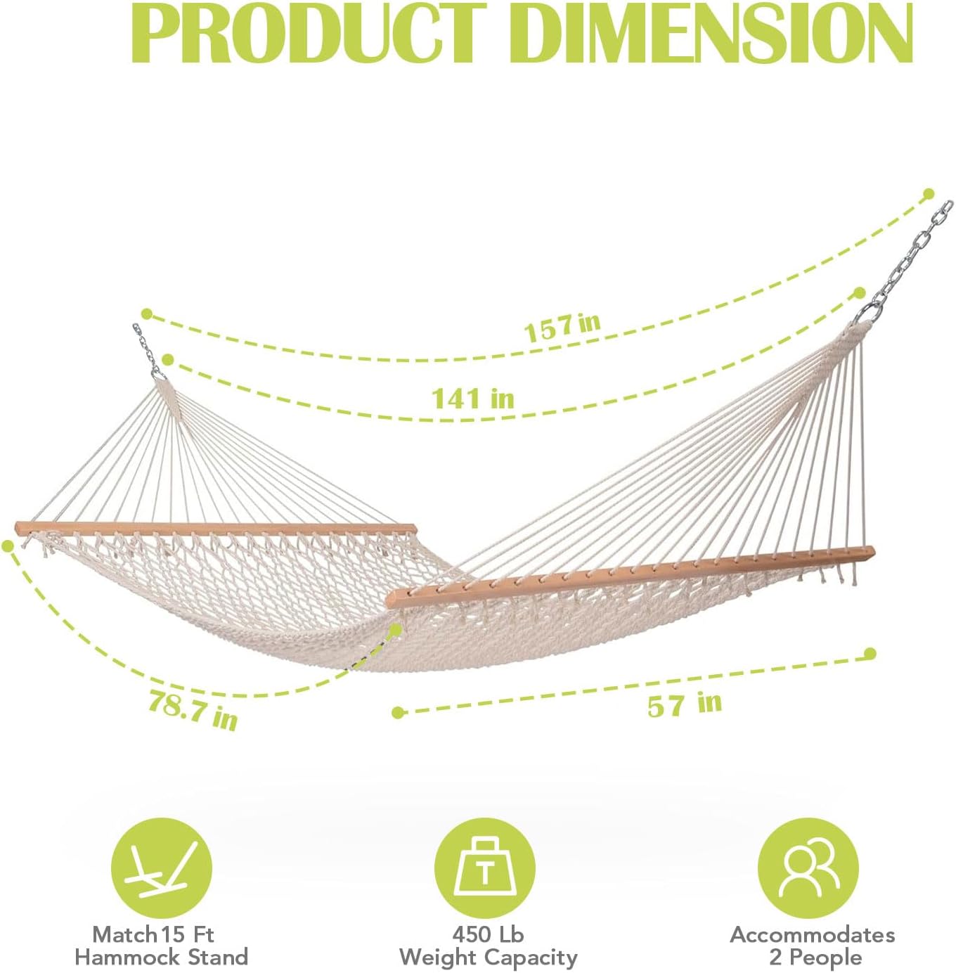 Lazy Daze Hammocks 12FT Double Rope Hammocks, Hand Woven Cotton Hammock with Spreader Bar for Outdoor, Indoor, Patio Yard, Poolside, FIT 15-Foot STAND, Max 450 Lbs, Natural, 141 x 57 inches