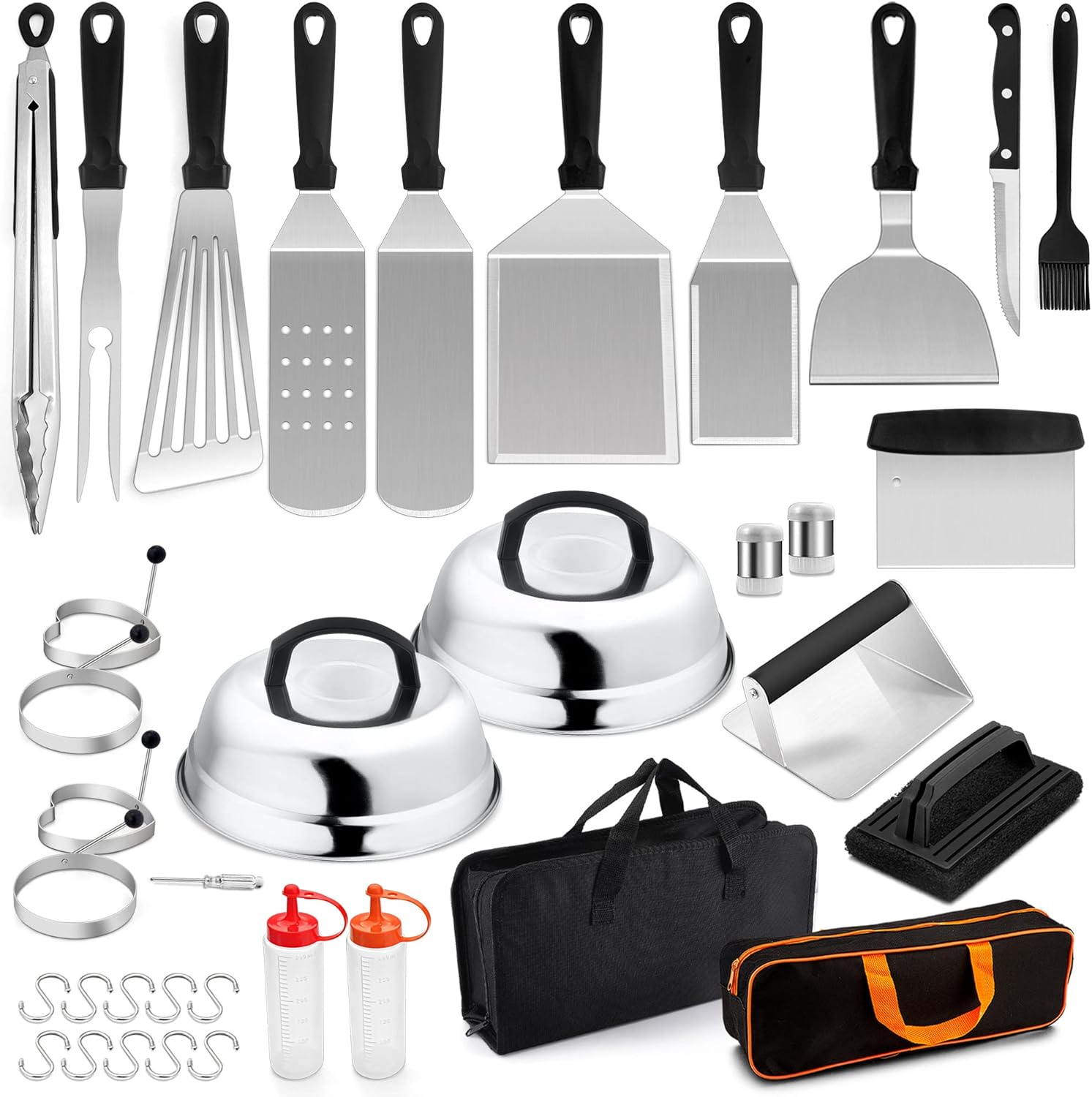 Leonyo Griddle Accessories Set of 25, Heavy Duty Stainless Steel Grill Griddle Metal Spatulas for Cast Iron Flat Top Teppanyaki Hibachi Cooking, Burger Press, 2 Melting Domes, BBQ Fork, 2 Carry Bags