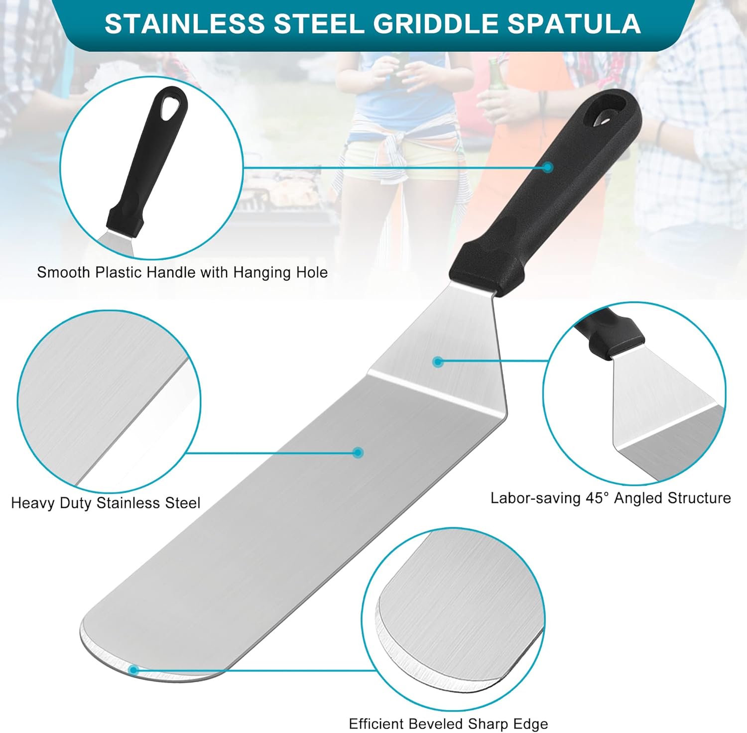 Ergonomics design, beveled edges of our spatulas and scrapers could make it more easy to flip or pick up food, you can even chop food with them directly on the griddle, saving your strength and time, handle and metal blade designed with 45-degree angle to keep a safe distance from the grill or griddle, preventing your hands from getting burn