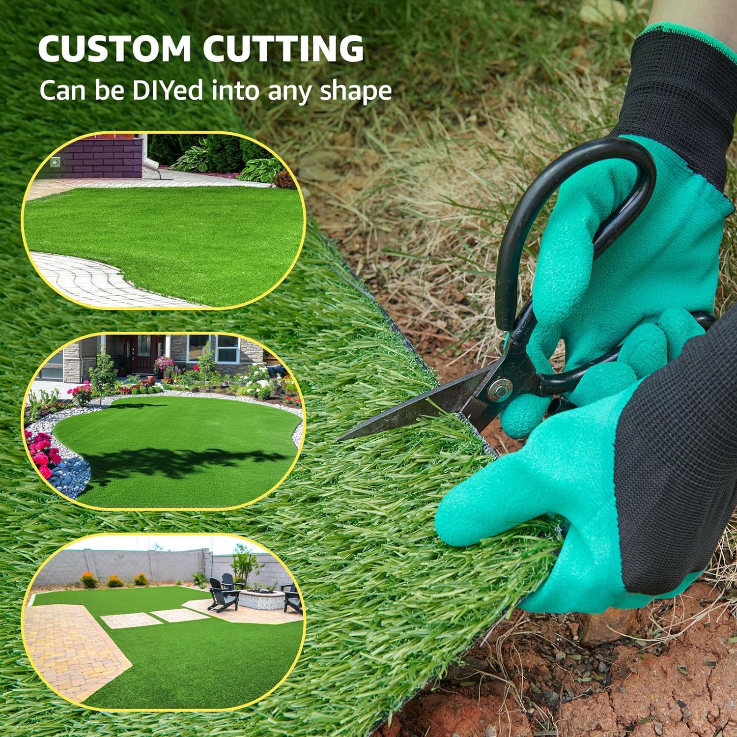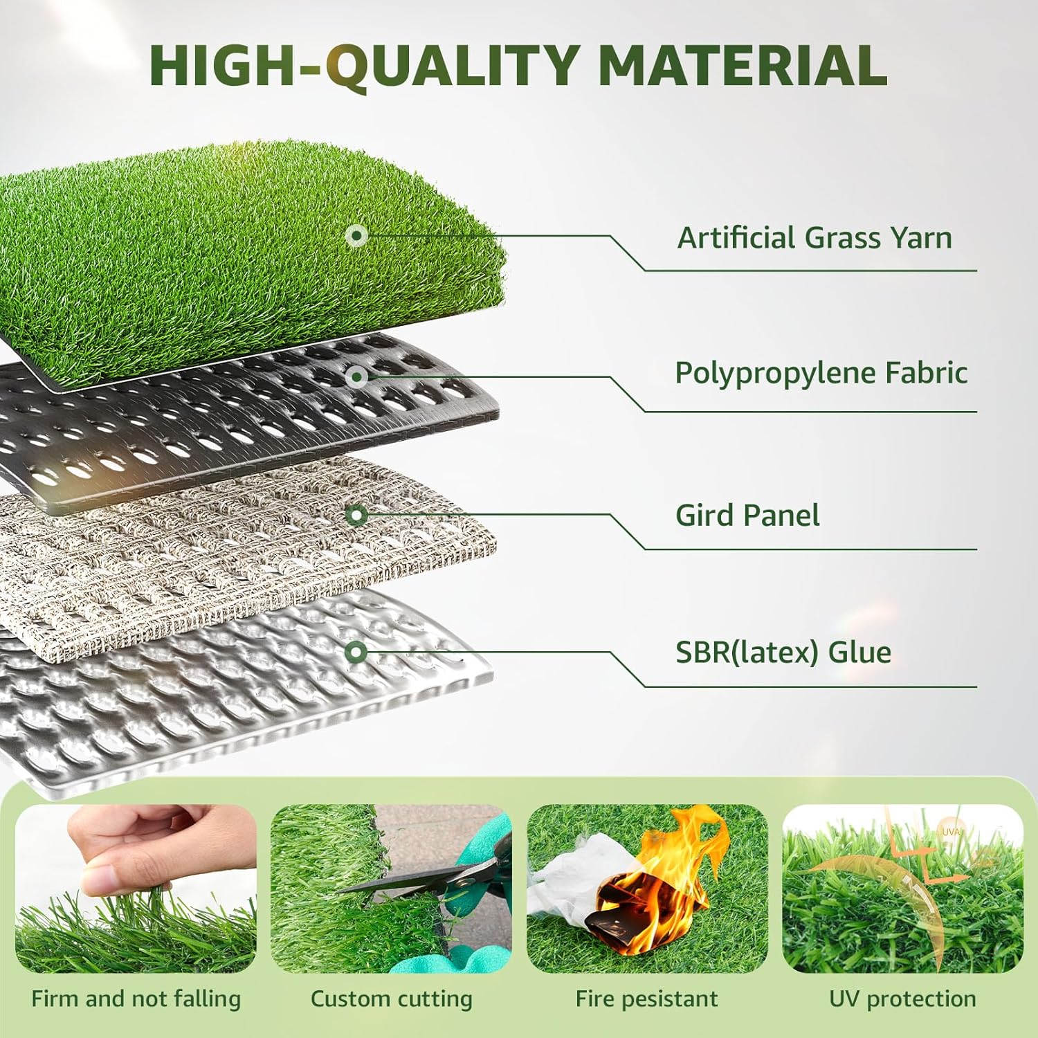 ✅【HIGH-QUALITY MATERIAL】Artificial grass is made of environmentally friendly PE&PP material, which is fireproof, UV-resistant, and easy to cut into the shape and size you want. Smooth grass filaments and a four-layer structure backing design make the fake grass carpet not fade or fall off for a long time in rain or sunshine.