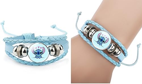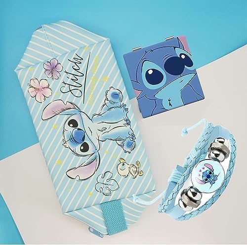 LOYEJEGL Stitch Stuff Travel Cosmetic Bag + Double Sided Cosmetic Mirror + bracelets,Large Capacity PU Travel Toilet Bag Makeup Accessories Organizer, Best Gift for Girls and Women (Blue-Stitch)