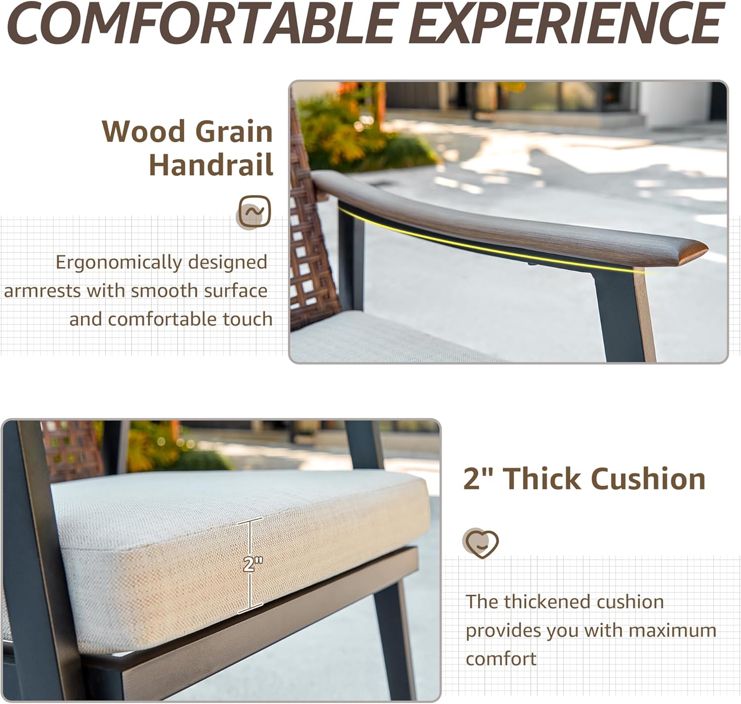 Relax Your Back & Waist & Arms – Ergonomically designed rattan chairs conform to the curve of the human spine and fit your curves better. Each chair is equipped with a 2-inch thick cushion filled with high-density sponge, which relaxes the muscles and makes the body more comfortable, and soothes the fatigue of your body after a busy day.