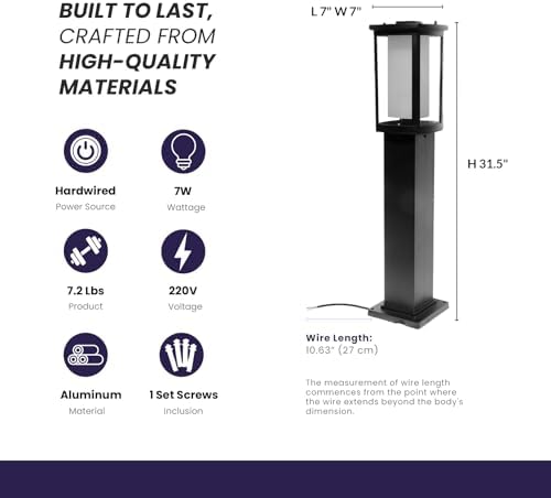 Versatile Stability – 240V AC-compatible Bollard Post Light ideal for outdoor gardens and commercial spaces, featuring two wires (10.6-inch and 5.8-inch), recommends installation on non-soil grounds for stability. Ensure grounded and safe connection.