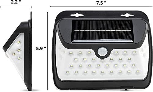 SOLAR MOTION SENSOR LIGHT: Motion flood light with 38 bright LEDs, a brightness of 150 lumens, 15w, and a run time of 12 hours on a one-day charge. Bright solar powered sensor lights for outside with no wires needed, ready to go out the box just set it and forget it.SOLAR POWERED: Solar spotlight is rechargeable with direct sunlight and fully charges in 8 hours. Cordless light activates for 20 seconds and then automatically turns off if there is no movement for energy savings.MOTION DETECTOR: PIR motion detection with 120-degree wide angle motion detection and motion activated from up to 16 feet away. Solar security lights to deter any unwanted strangers or wildlife away. Home motion lights to brighten your yard at night.OUTDOOR SECURITY LIGHTING: Constructed of durable ABS+PC heat proof plastic with a IP64 weather and water-resistant rating. Can even work as an outdoor security camping night light for those dark areas or as backyard lights.HOME DECOR: Outside motion lights for your house or business, light up your porch, deck, driveway, gutters, garbage area, or any outdoor pathway with this patio décor light. Easy install to your fence or most walls with the provided mounting screw hardware.
