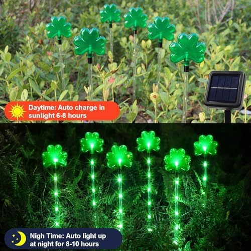 【Set of 6 St Patricks Day Shamrock Lights】Our set of 6 solar St Patricks shamrock pathway lights, designed with green led glow stem and 3.14 x 2.9inches dimmable big green shamrocks shaped, built-in Irish kelly green lights, give off very attractive kelly green color, very bright, visible and eye-catching outdoor St Patricks Day Decorations.