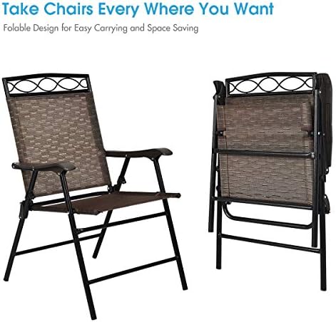 ⛱️【Ergonomic Design of Folding Chairs】 The ergonomic backrest, curved armrests and breathable fabrics provide you with a comfortable sitting experience. The height from floor to seat is 16.5”, so you can easily get out of the chair. The patio bistro set features a space-saving design with locking catch device, 2 lightweight chairs folds up for easy wintertime storage transportation.