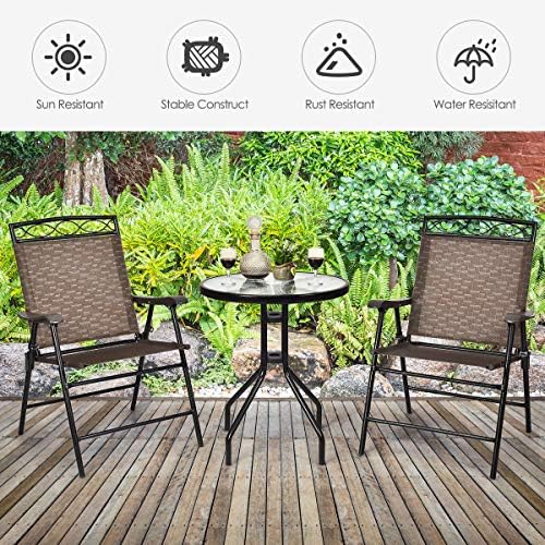 🥤【3 Piece Bistro Conversation Set】The outside furniture set comes with a round tempered glass table and 2 folding chairs to provide you a comfortable sitting area, perfect for enjoying your morning coffee and sipping your favorite drink in the afternoon & evening. Table Size: 24″ x 28″ (Dia. x H), Chair Size: 24.5″ x 25″ x 35.5″ (L x W x H).