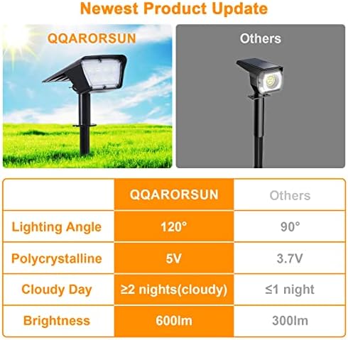 ⚡[120°adjustable] For QQARORSUN solar LED spot lights outdoor, you can easily rotate solar panel and light head 120°up and down,which provides a ultra brightness for a wide area.It can illuminate longer, and match any decorating style.The solar yard light illuminates your home and makes it looks like safer and more welcoming.