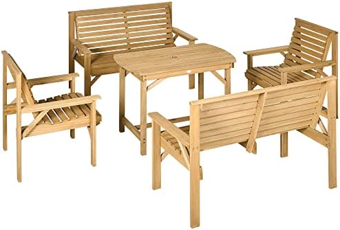 Outsunny 5 Piece Wooden Patio Dining Set for 6, Outdoor Conversation Set with 2 Armchairs, 2 Loveseats, and Dining Table with Umbrella Hole for Backyard, Garden, Light Brown