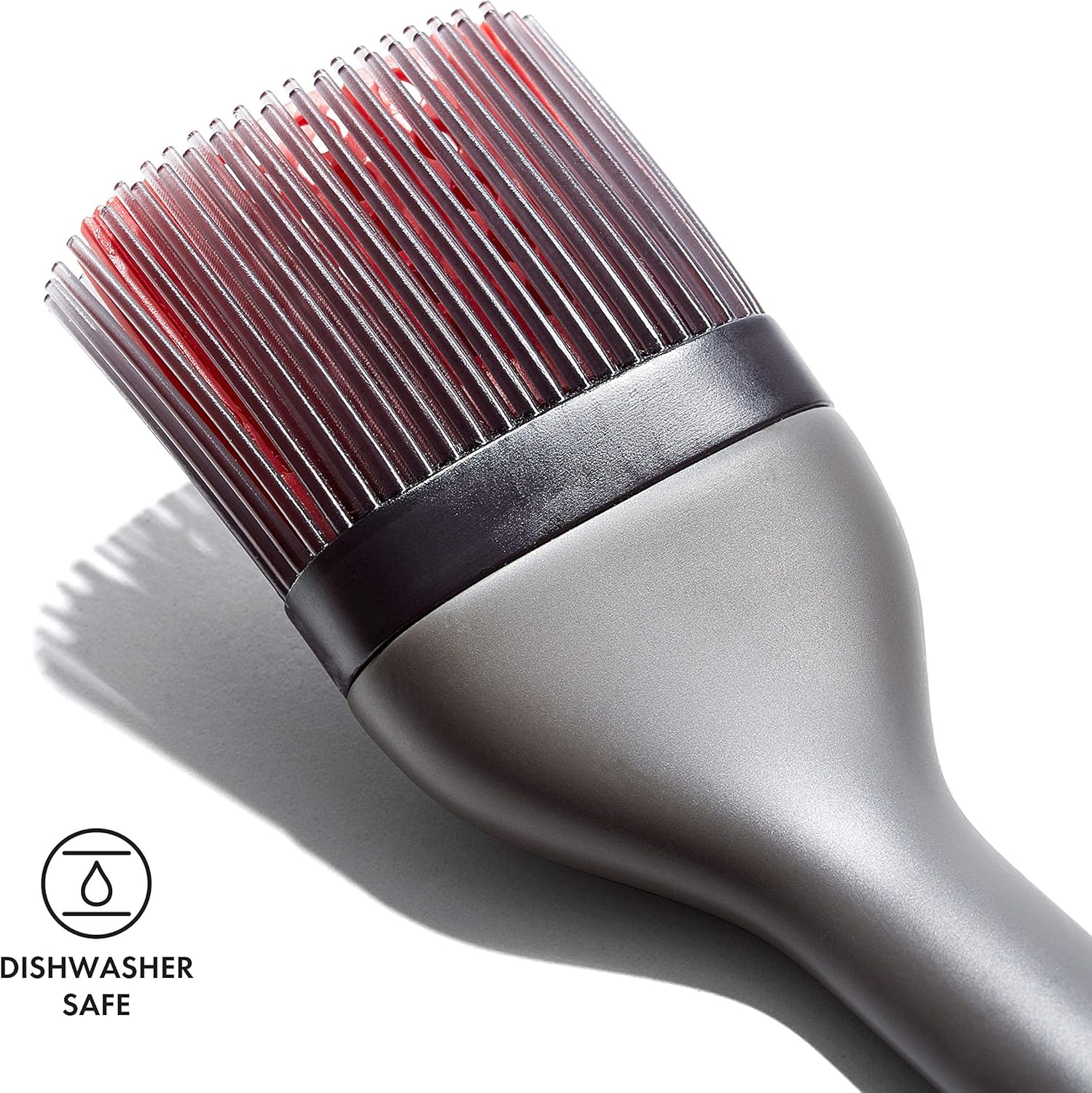 The OXO Good Grips Silicone Basting Brush helps you easily create golden-brown roasts and saucy grilled ribs. The heat-resistant silicone bristles are easy to clean: They won’t retain odors, shred or clump. Our patented center-hole bristles feature a gap that holds liquids for efficiently applying sauces or basting with drippings. The tapered design of the outer bristles lets you brush over thin and delicate foods. The angled brush head keeps bristles elevated above countertops to avoid messes. Dishwasher safe.