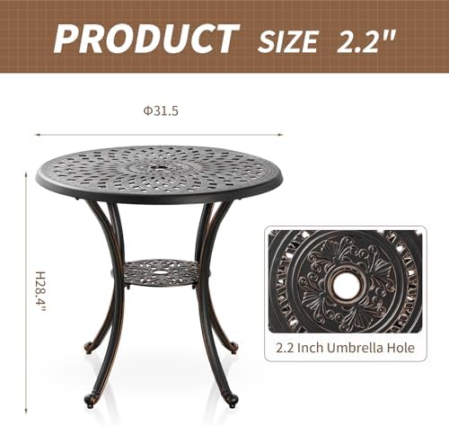PATIO-IN 3 Piece Patio Bistro Set, Outdoor Cast Aluminum Dining Set, Patio Bistro Furniture Set Round Table with Umbrella Hole for Backyard Lawn Garden
