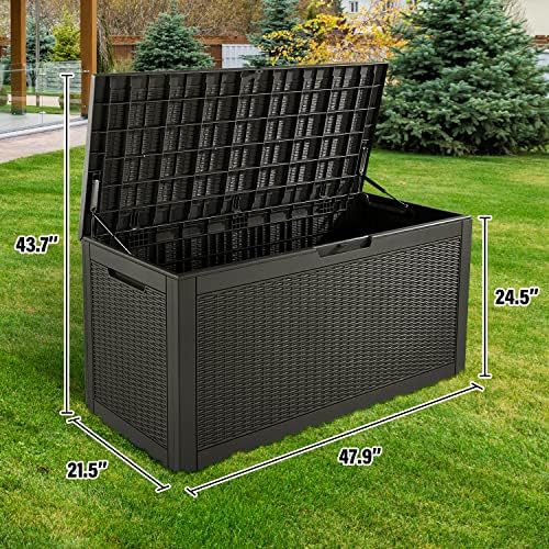 ✨Super Storage Space: The deck box has a storage capacity of 100 Gallon with totally dimensions: 48″L x 21″W x 25″H.It used for sorting out sundries, placing garden tools, watering cans, shovels, brooms, etc., and also storing children’s cart toys.
