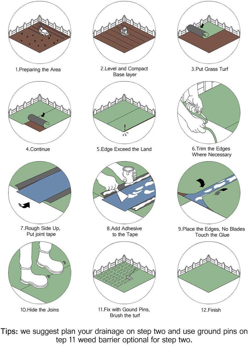 Perfect for indoor used as Mat, Carpet . DIY Decorations for Fence Backdrop, interior and exterior or your own creative design on party, Wedding, Christmas decorations. Also used in outdoor rugs, such as Garden, Lawn, Patio, Landscape, Backyard, Balcony,Deck, Porch and other outdoor place. Recommended use it with lawn nails. Landscape staples help you fix it on lawn/hard soil ground, https://www.amazon.com/dp/B079R7RVCW