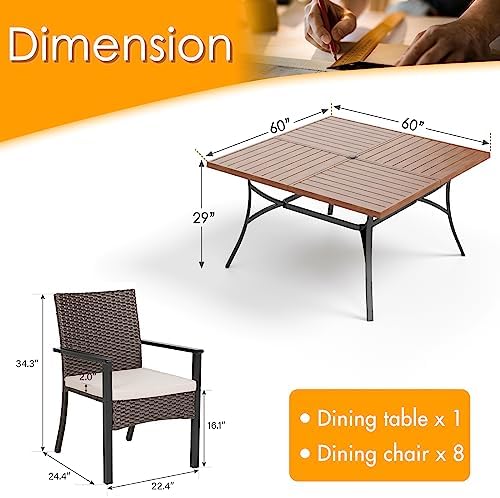 PHI VILLA 9 Pieces Patio Dining Set for 8, 60” Wood-Like Large Square Metal Steel Dining Table & Rattan Wicker Chairs with Cushions, Outdoor Dining Furniture for Deck, Yard, Porch