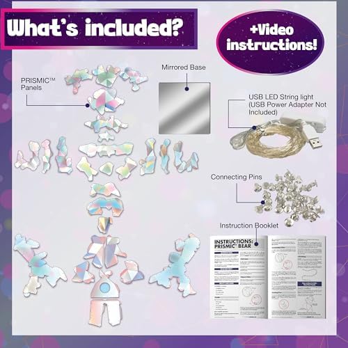 What’s Included? Build-Your-Own Prismic: Bear Lantern includes Prismic panels, connecting pins, a mirrored base, USB-powered LED string lights, and full step-by-step written instructions (video instructions also available). It has everything you need to make a cute gift for your teen’s bedroom!