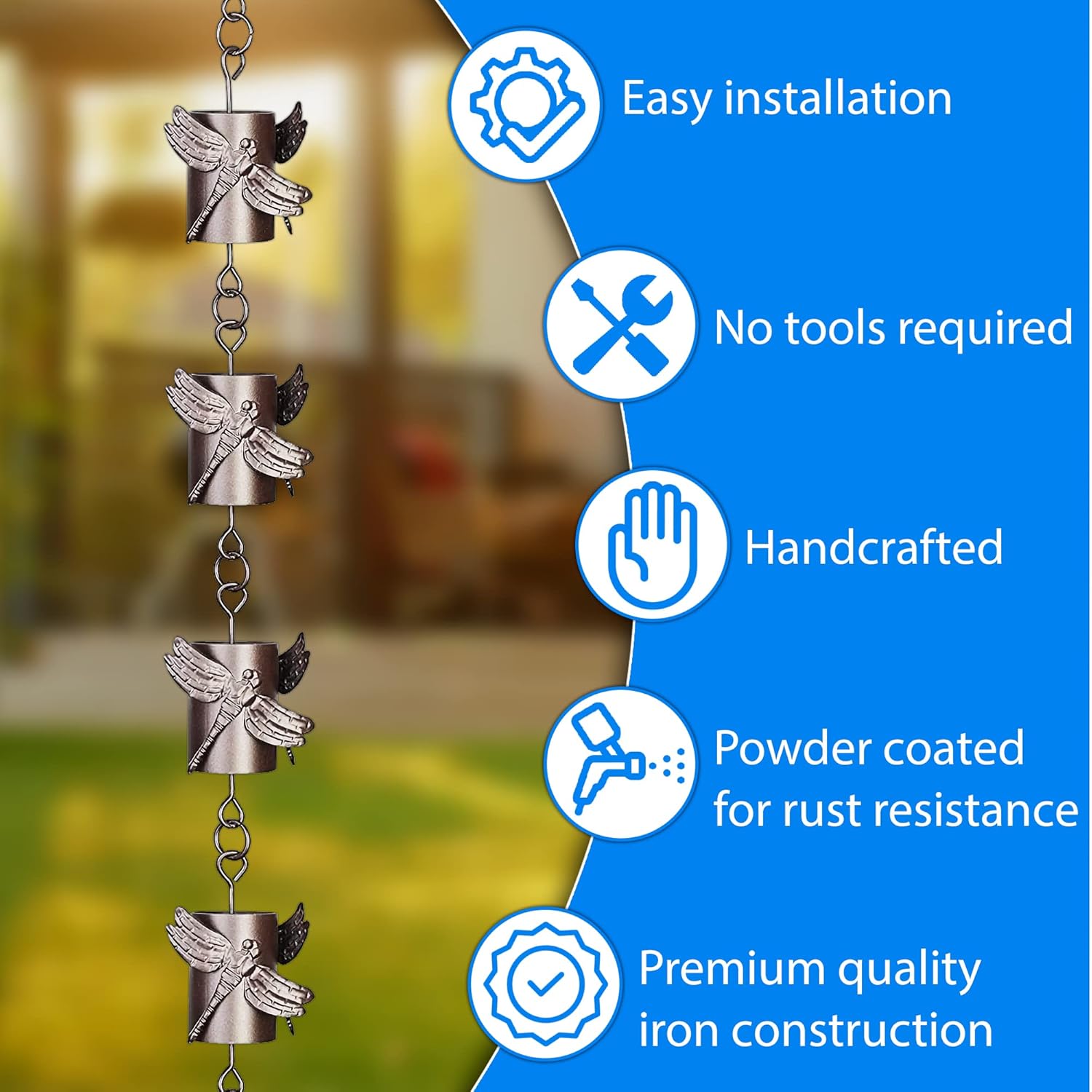 Quick and hassle-free installation: This rain chain has a top & bottom opening of 2” while the cup height is 2.5”. No need to use tools or follow an elaborate set of instructions. A great choice for those who want to add a decorative element to their outdoor space without the lengthy installation process.