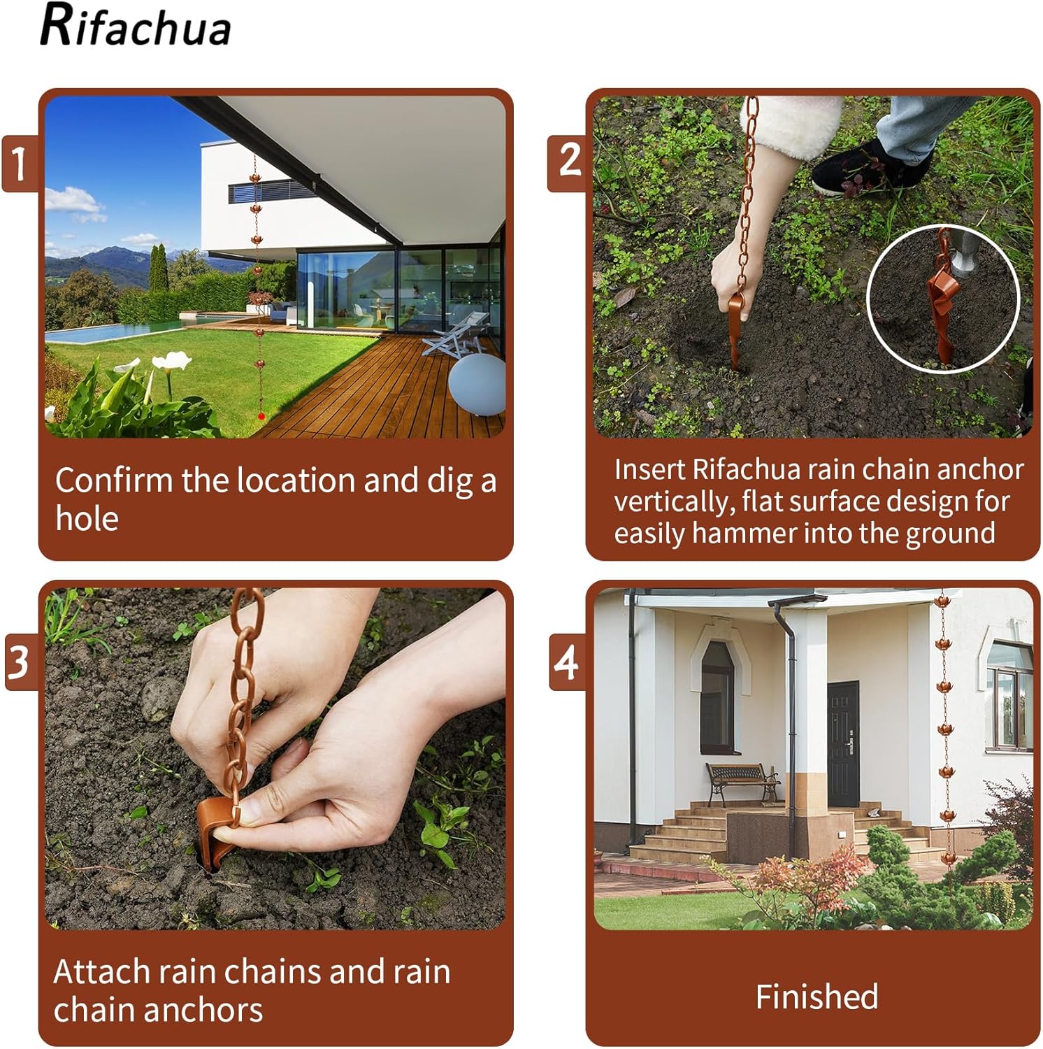 【Beautiful & Secure】Anchoring with Rifachua chain stake prevents the rain chains from swaying in strong wind. No matter insect it in garden, yard, pot or other places, the rain chain stake will be a beautiful and secure decoration coordinate with exquisite rain chain.