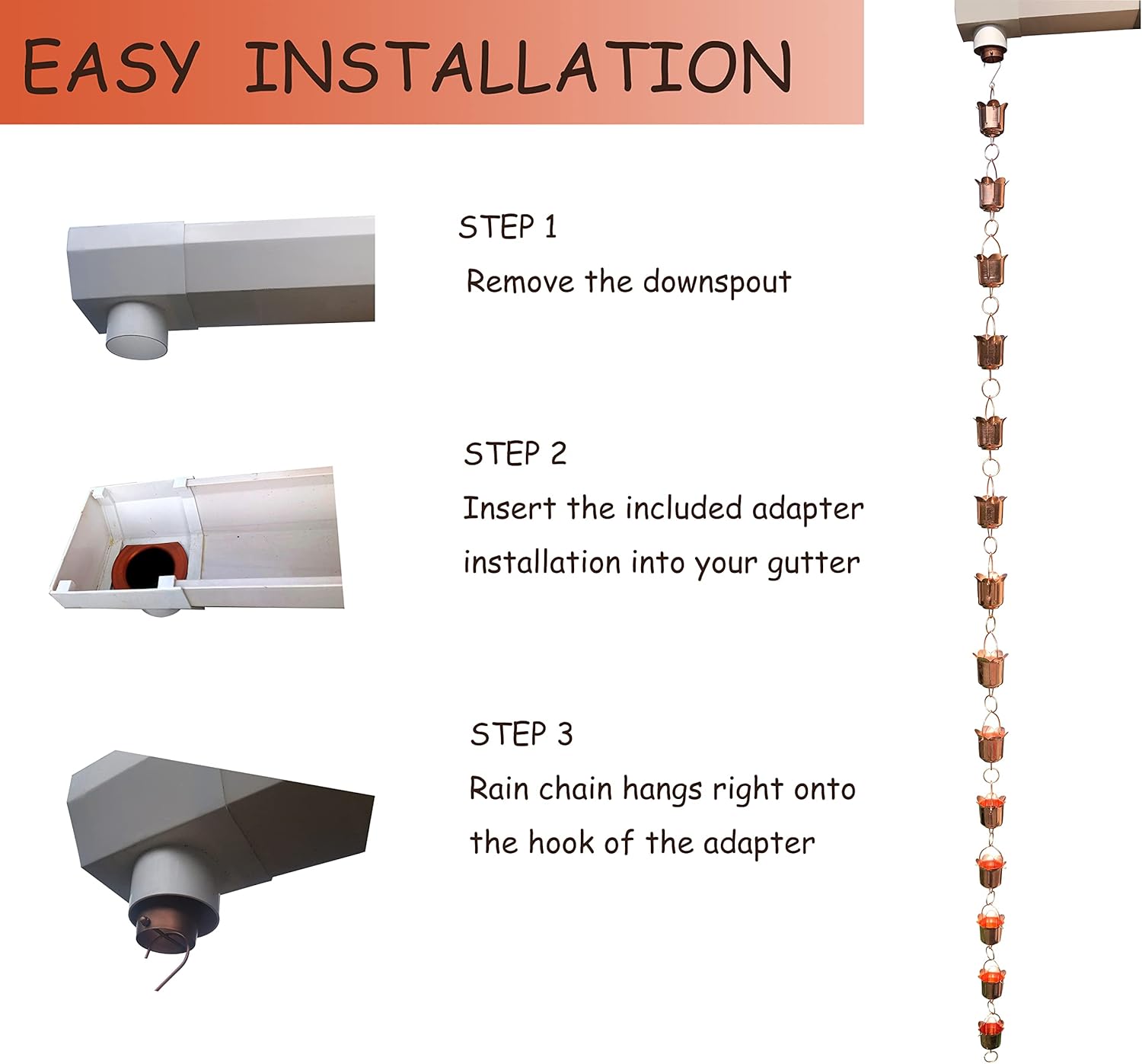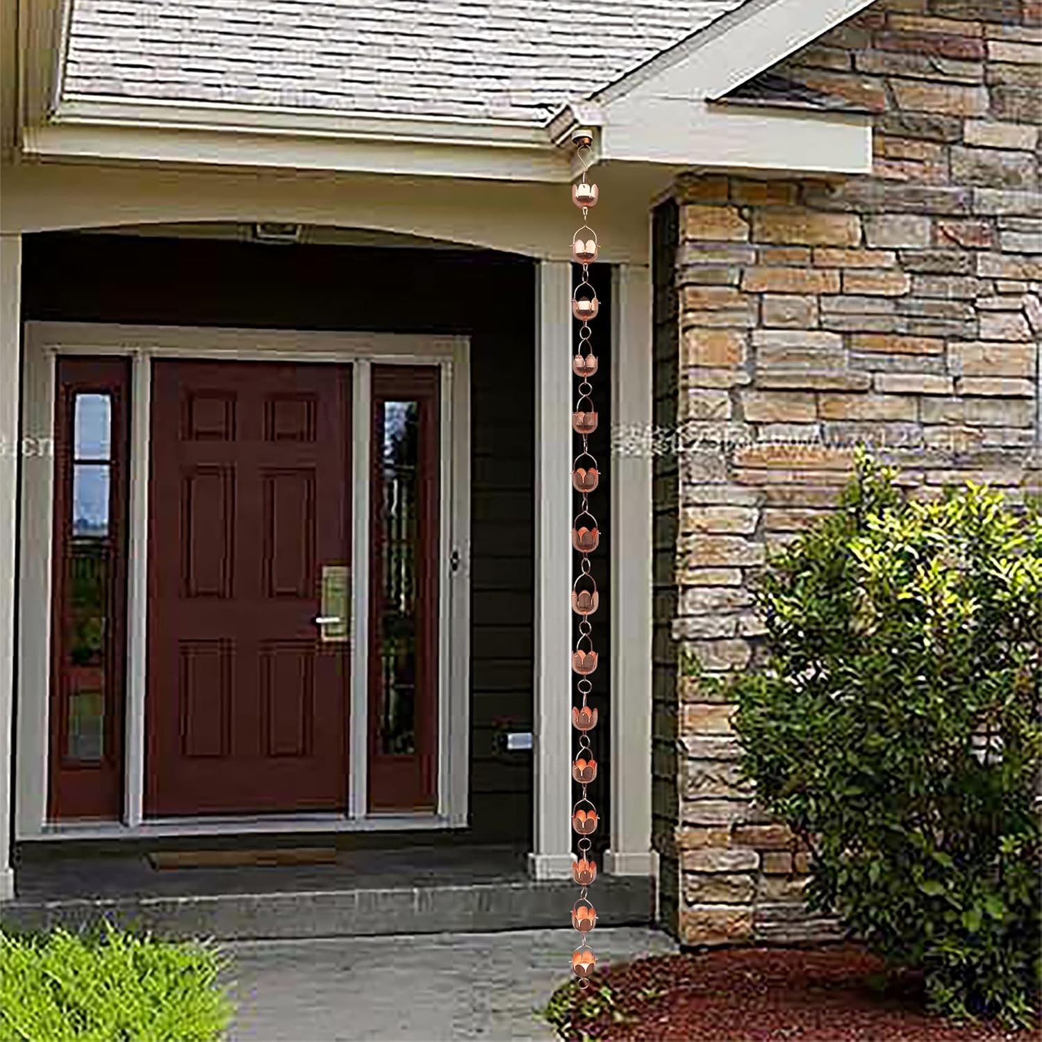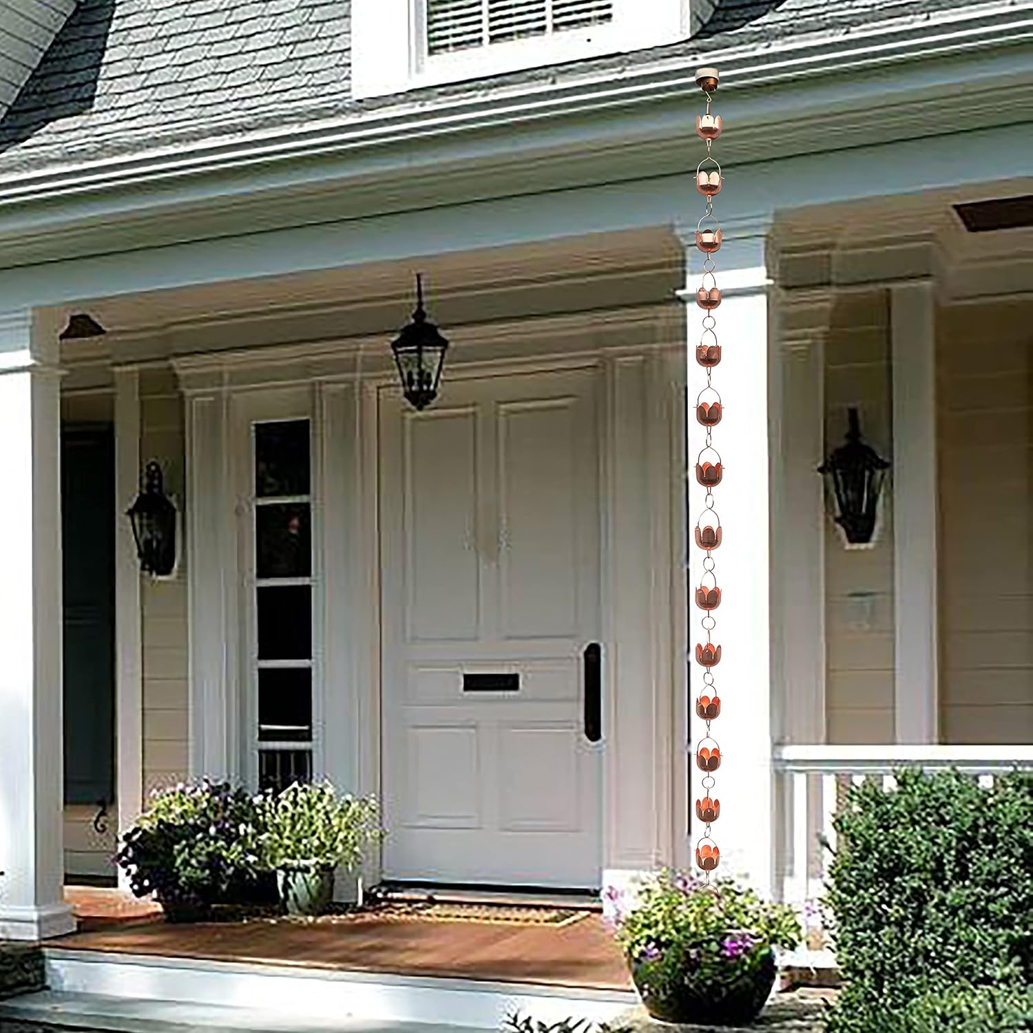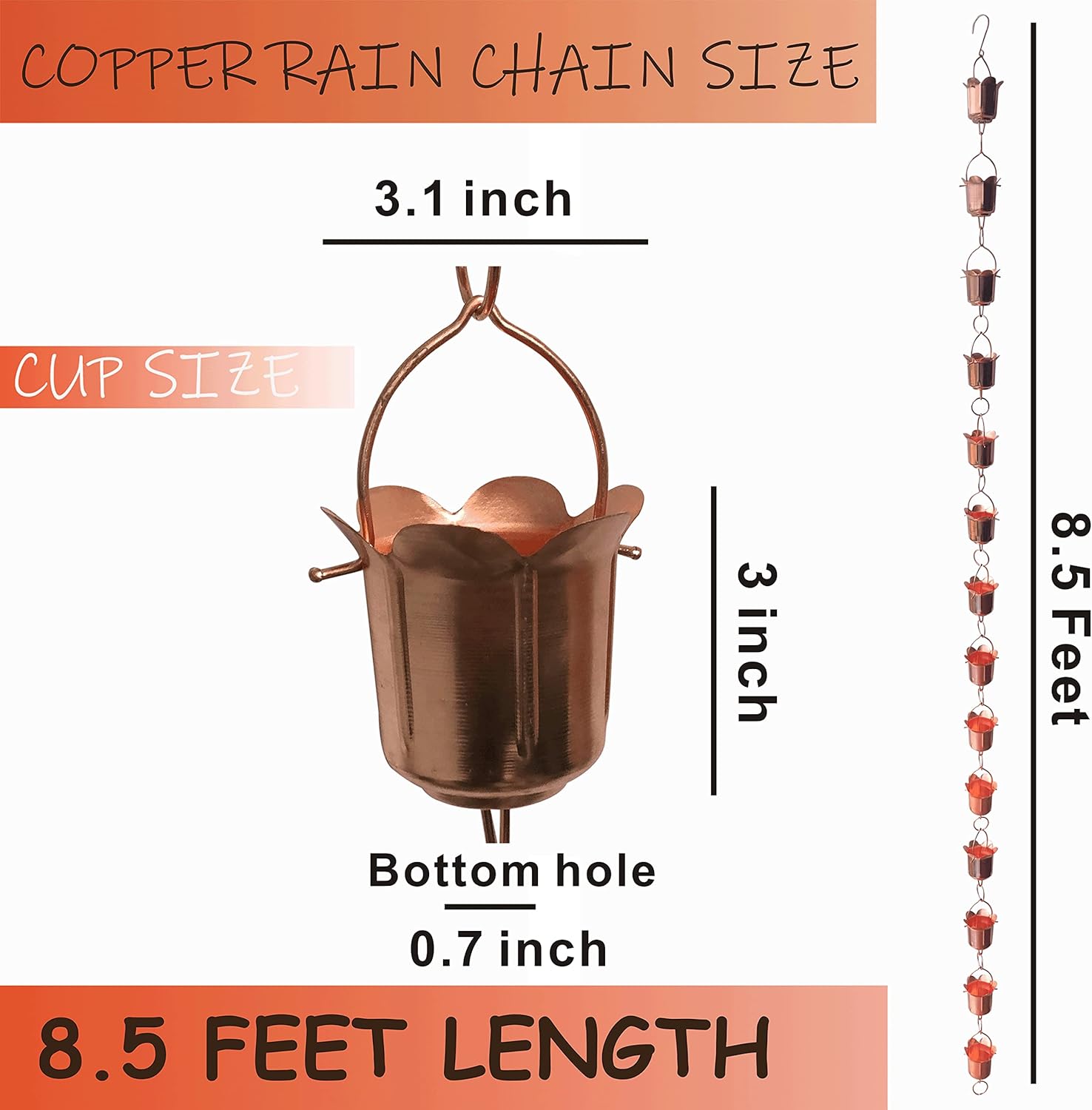 TFYADEN Pure Copper Garden rain Chain is a Functional and Decor Replacement for Gutter Downspouts. remove mundane downspout; use our tulip copper rain chain. sound of running water and chimes make you closer to nature.This pure copper tulip cup rain chain is made by 15 pcs copper lotus end to end. size of cup is dia 3.1 in x3 in high. the length is 8.5 ft. It is almost suitable for all kind of house. copper links and copper tulip cups. Free Gutter Adapter.
