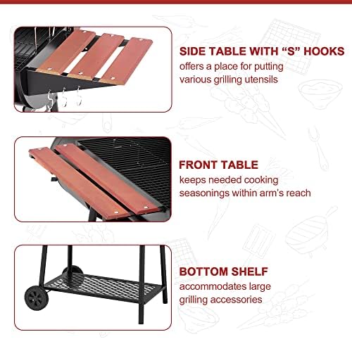Ample Prep Space: The wood-painted front table and side table offer more workspace for preparation; while three extra “S” hooks are used for hanging grilling utensils.