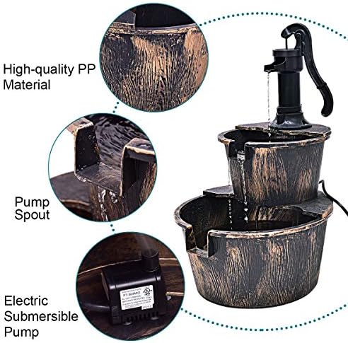S AFSTAR Water Fountain Outdoor Waterfall Barrel, 2-Tier Barrel and Pump Waterfall Fountain W/Realistic Faux Wood Barrels & Pump Head, Garden Pump Barrel Fountain for Patio Deck Backyard Decor