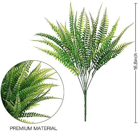 [SIZE & PACKAGE]: The 12 bundles fake boston ferns bushes have a total length of 16.8 inch. Please expand and adjust the stem into original shape after receiving. Each leave can be disassembled or assembled at will. It’s normal if leaves fall off, just install it to original place.