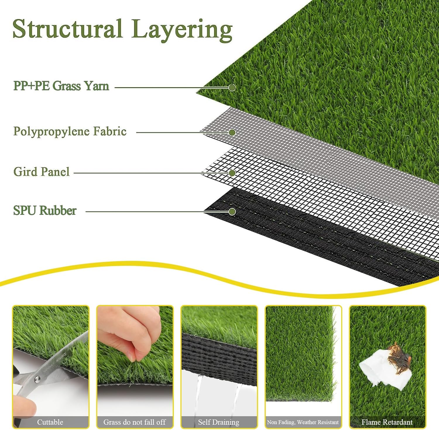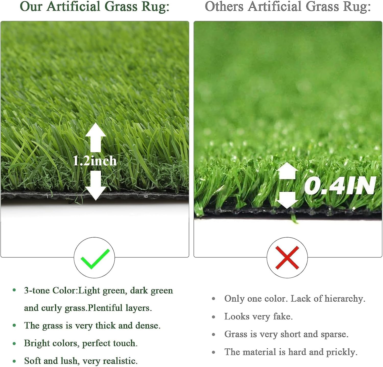 PREMIUM QUALITY SYNTHETIC GRASS TURF: Artificial turf outdoor rug uses top PE&PP synthetic materials and rubber backing to ensure product quality and safety. With good wear resistance and resilience, not easy to fall off or fade, it is an excellent fake grass outdoor rug for pets and family to play on.