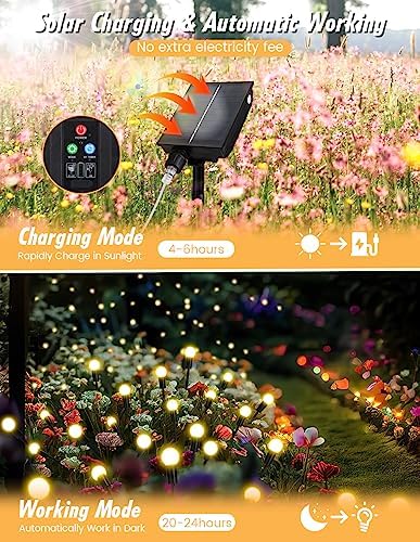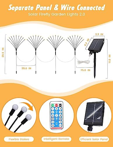 【New – Remote Control & 8 Lighting Modes】This version of outdoor firefly lights has a new remote control function. 8 lighting modes, 3-level brightness and 4 working hours can be set by controller. You can easily switch modes with remote controller instead of walking to garden time by time.