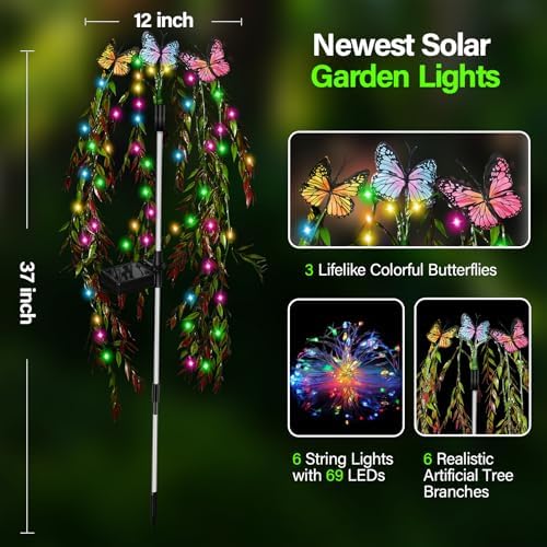 Solar Garden Lights Outdoor Decorative Waterproof, 69LED Swaying Willow Tree Solar Lights for Outside, Butterfly Flower Lights Solar Power Yard Decor for Pathway Patio Lawn Party Decorations