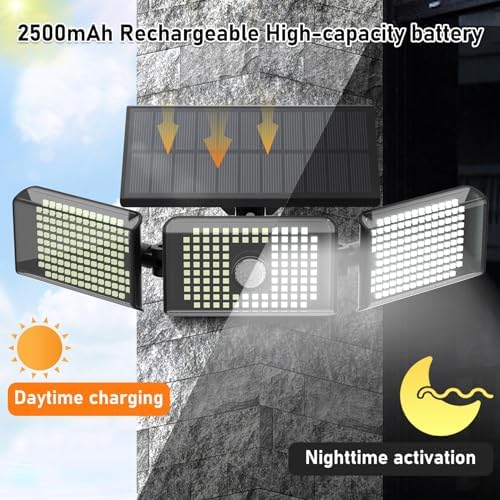 Solar Lights Outdoor 3600LM 260LED, IP65 Waterproof Motion Sensor Flood Lights with 3 Lighting Modes, 3 Heads Wide Angle Security Light for Pathway Yard Porch Garage Walkway, 2 Pack