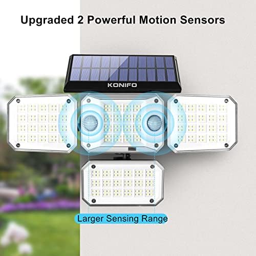 Unique 4 Adjustable Lighting Heads: innovative 4 flexible lighting heads design, the 4 heads can be move up,down and horizontally to achieve 320° wide lighting angle, the illumination range can reach 2000 square feet, which can illuminate larger areas than similar solar spotlight.