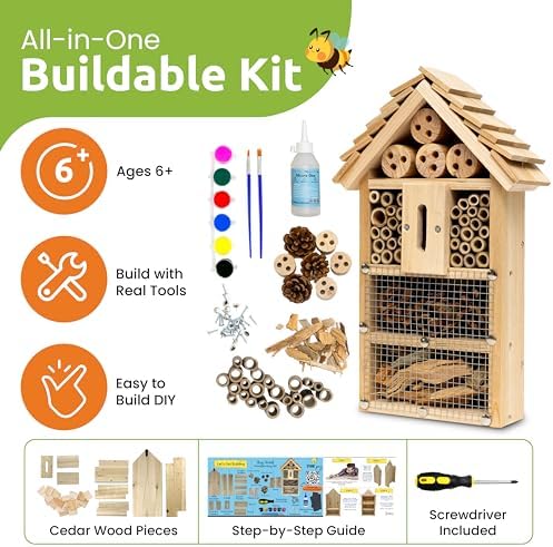 Premium Bug Hotel For Kids: High-quality bug hotel kit made from solid cedar wood for long-lasting durability. Engage your kids with a cute DIY bug hotel, a fun nature education gift!