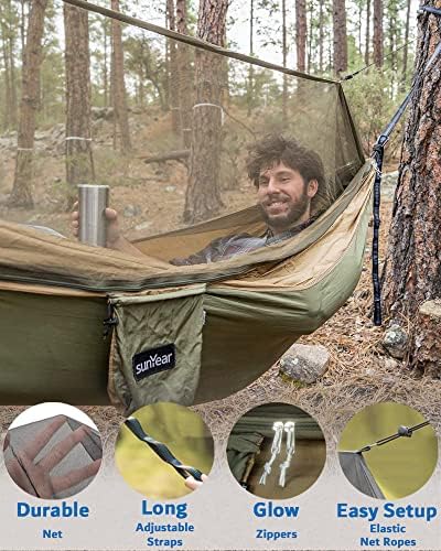 Sunyear Hammock Camping with Rain Fly Tarp and Net, Portable Camping Hammock Double Tree Hammock Outdoor Indoor Backpacking Travel & Survival, 2 Tree Straps,100% Waterproof