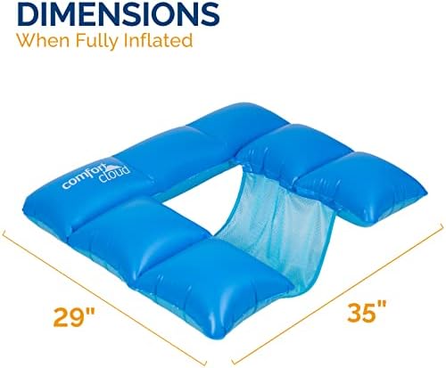 Float among the clouds with the Swimways Comfort Cloud Sling Seat adult pool lounge chair! This inflatable pool chair is designed to provide maximum comfort with a cloud-like aesthetic, elevating your floating experience. The textured soft PVC material paired with the unique cloud-like cushion support allow you to float for hours in complete relaxation. The Comfort Cloud Sling Seat comes with back and arm support in an upright seated position, keeping your body just below the water’s surface to remain submerged at swimming pools or the lake. This ergonomic pool raft measures about 35” by 29” when fully inflated and supports up to 250 lbs, providing stability and comfortably cradling you in a cloud-like floating experience. The unique mesh seat on this inflatable pool chair keeps you cool while floating, and molds to your body shape by expanding and contracting to match the buoyancy of the water. The exclusive Hyper-Flate Valve technology maximizes airflow in while preventing airflow out to provide efficient ultimate speed inflation and deflation that works three times faster, for easy portability and storage. Swimways’ cloud-like design with soft cushions and beautiful sky-blue colors will make you feel like you’re floating among the clouds! Choose the best float for you with our new water level profile! The Swimways Spring Float offers the most portability, Dry Floats keep you dry while you float, and the Comfort Cloud allows you to float in ultimate comfort!