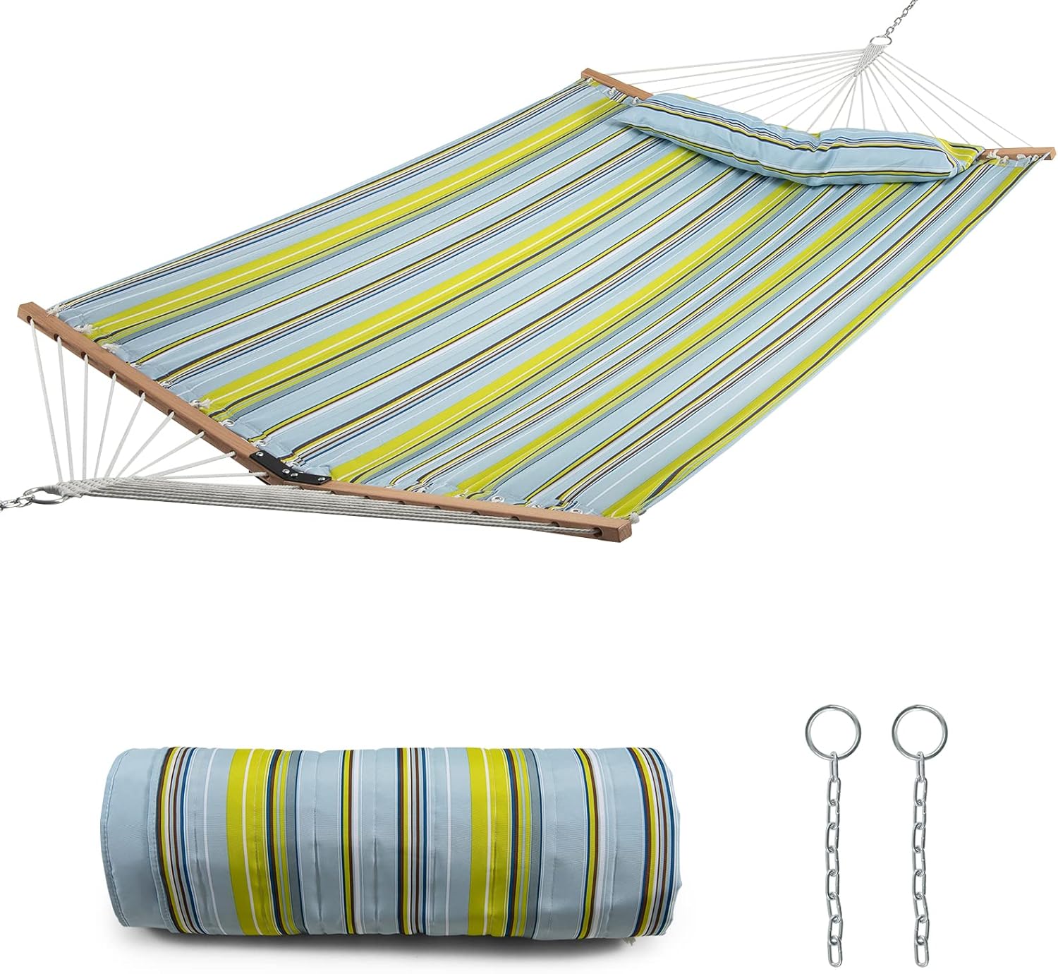 Tangkula 10.5FT Double Hammock, Heavy Duty Outdoor Hammock with Curved Spreader Bars, Detachable Pillow, 2 Person Hammocks for Outside, Porch, Patio (Stand is not Included) (Light Blue+Yellow)