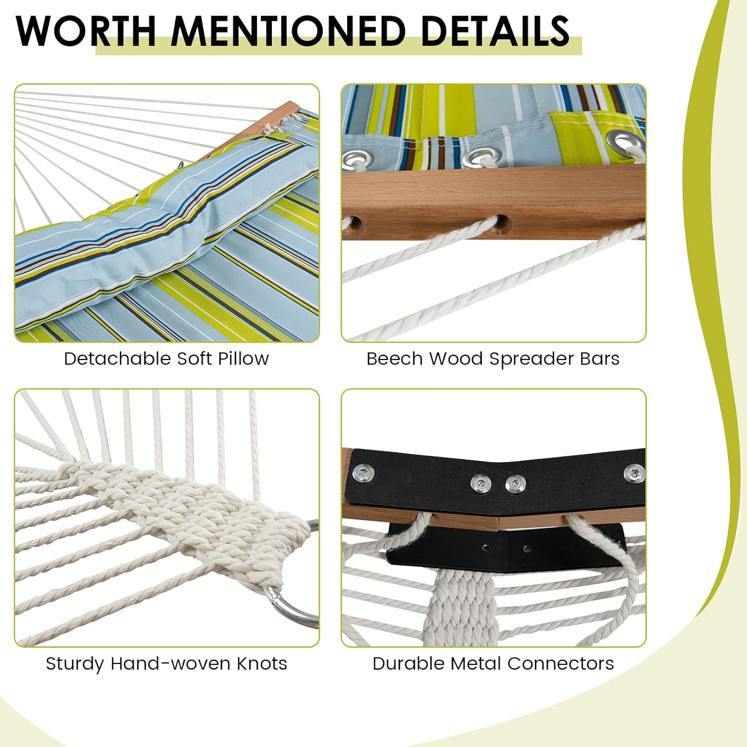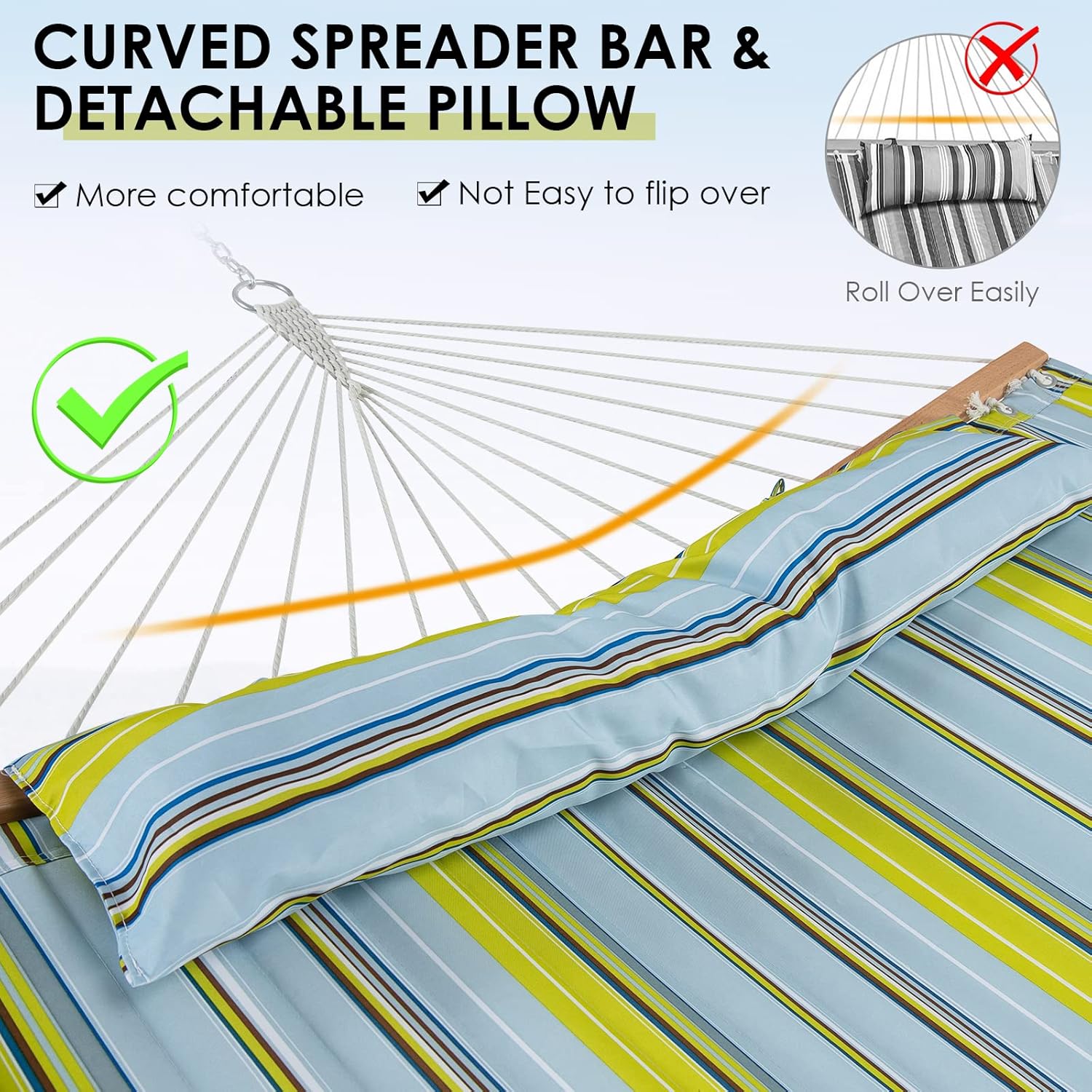 Curved Wood Spreader Bar: The outdoor hammock measures 126″ long with two 55.5″ solid beech wood spreader bars. Designed with curved ergonomic design, spreader bars are stable and not easy to flip over, offering you a comfy nap without the anxiety of falling down. The countersunk spreader bar holes can reduce the friction between the rope and the wood.