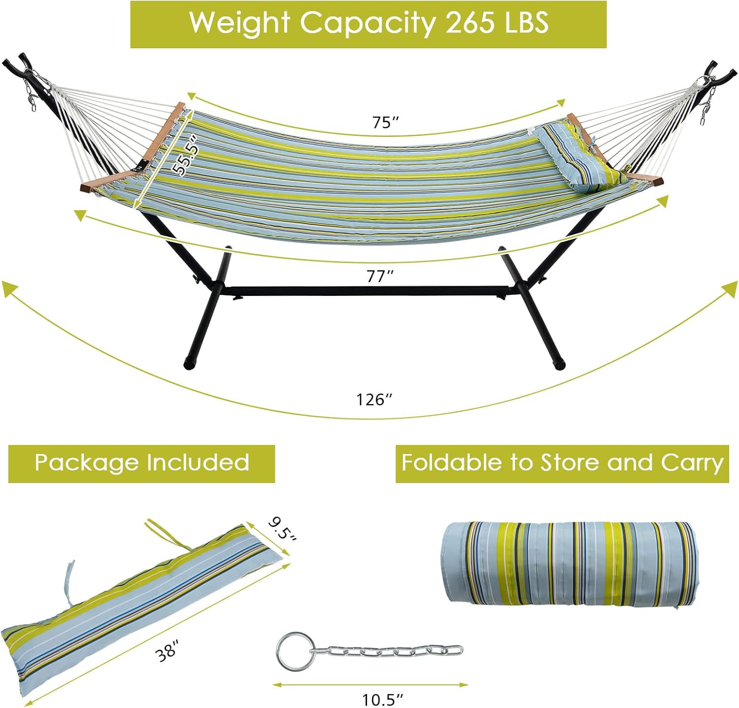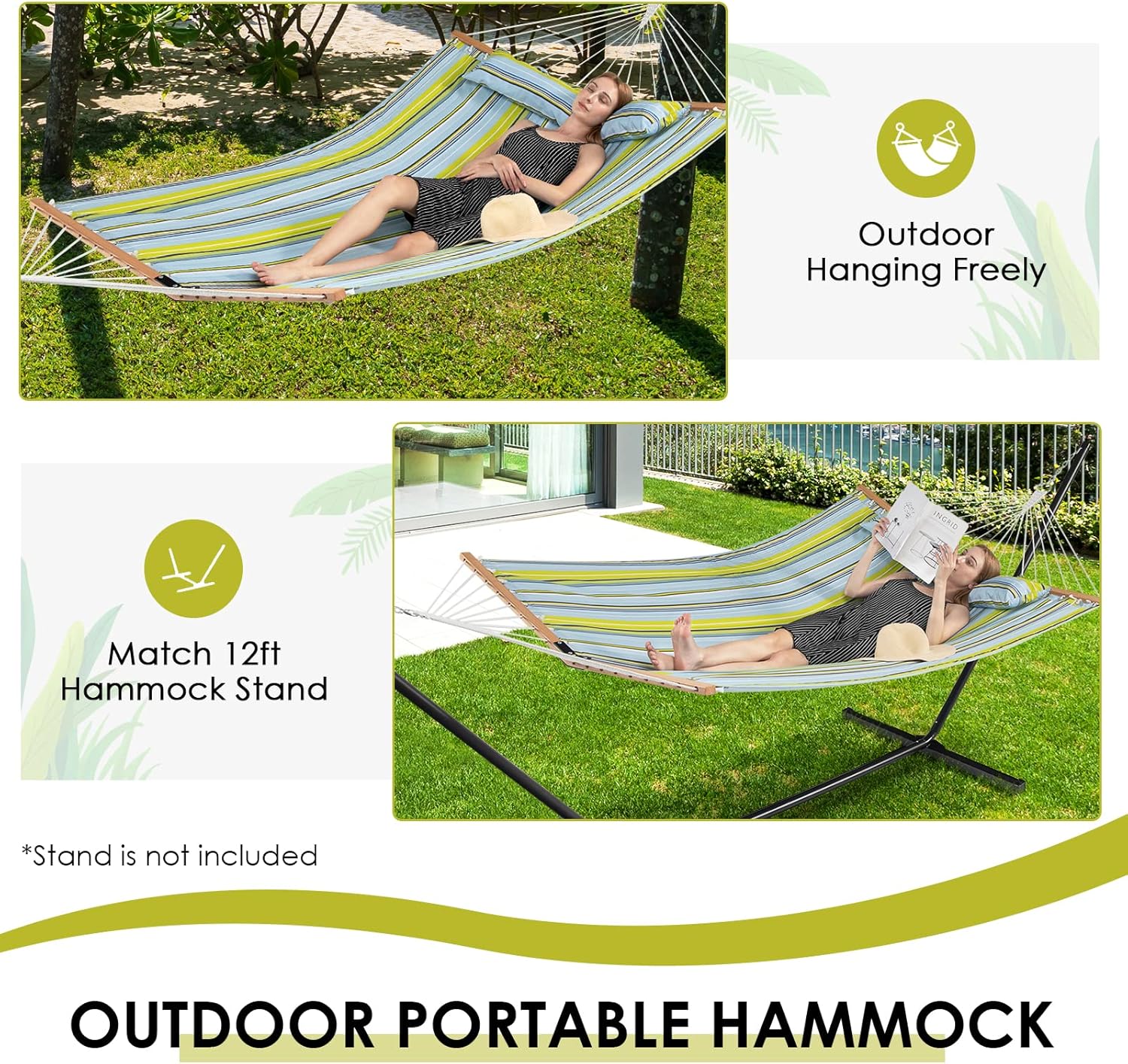 Easy setup and Folding Design: All the necessary hardware and instructions are included for your easy and labor-saving assembly. The folding and lightweight size does not occupy storage space for easy storage and is easy to be carried outdoors. You can hang it outdoor freely or match a 12 ft hammock stand(not included).