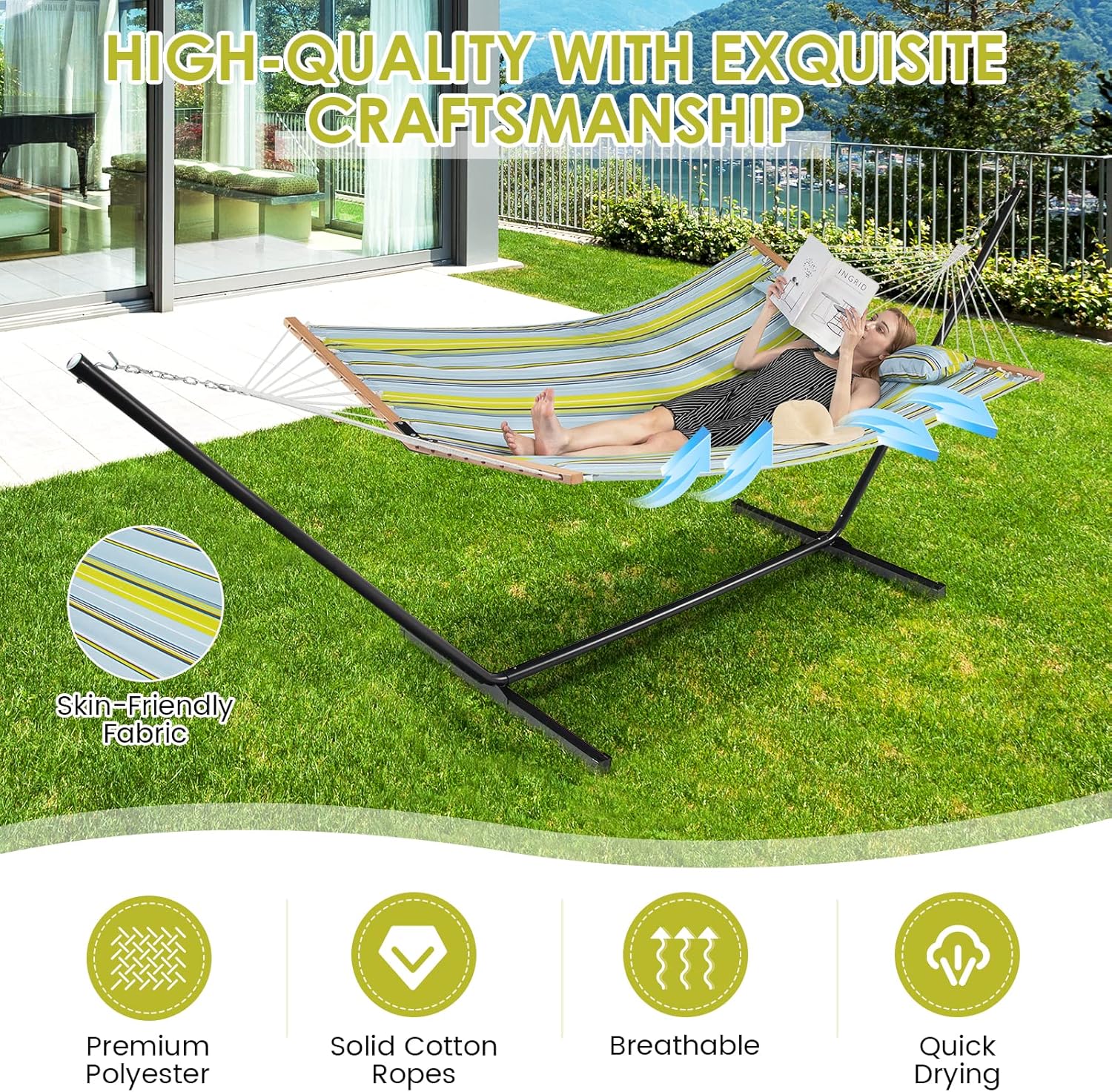 Versatile Usage for Outdoor Relaxation: Coming with a sleek and simple look, the outdoor quilted hammock boasts a practical design that can add a functional accent to any space. It can be used in the garden, patio, yard, or indoors in the sunroom, basement, or wherever you need to spend your leisure time for relaxation.