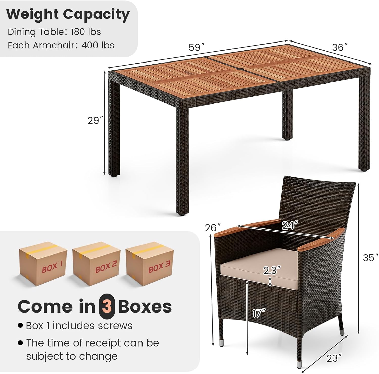 Durability Meets Style: The natural acacia wood and mix brown PE rattan not only endow this outdoor dining set with higher durability and stability but also add a rustic yet modern addition to your outdoor space.