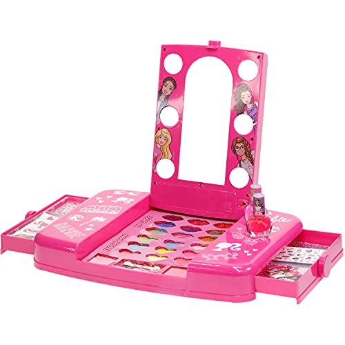 Townley Girl Barbie Beauty Vanity Set with Light-Up Mirror | Includes Lip Gloss, Eye Shadow, Brushes, Nail Polish, Accessories, and More! |Ages 3+ | Perfect for Parties, Sleepovers, and Makeovers