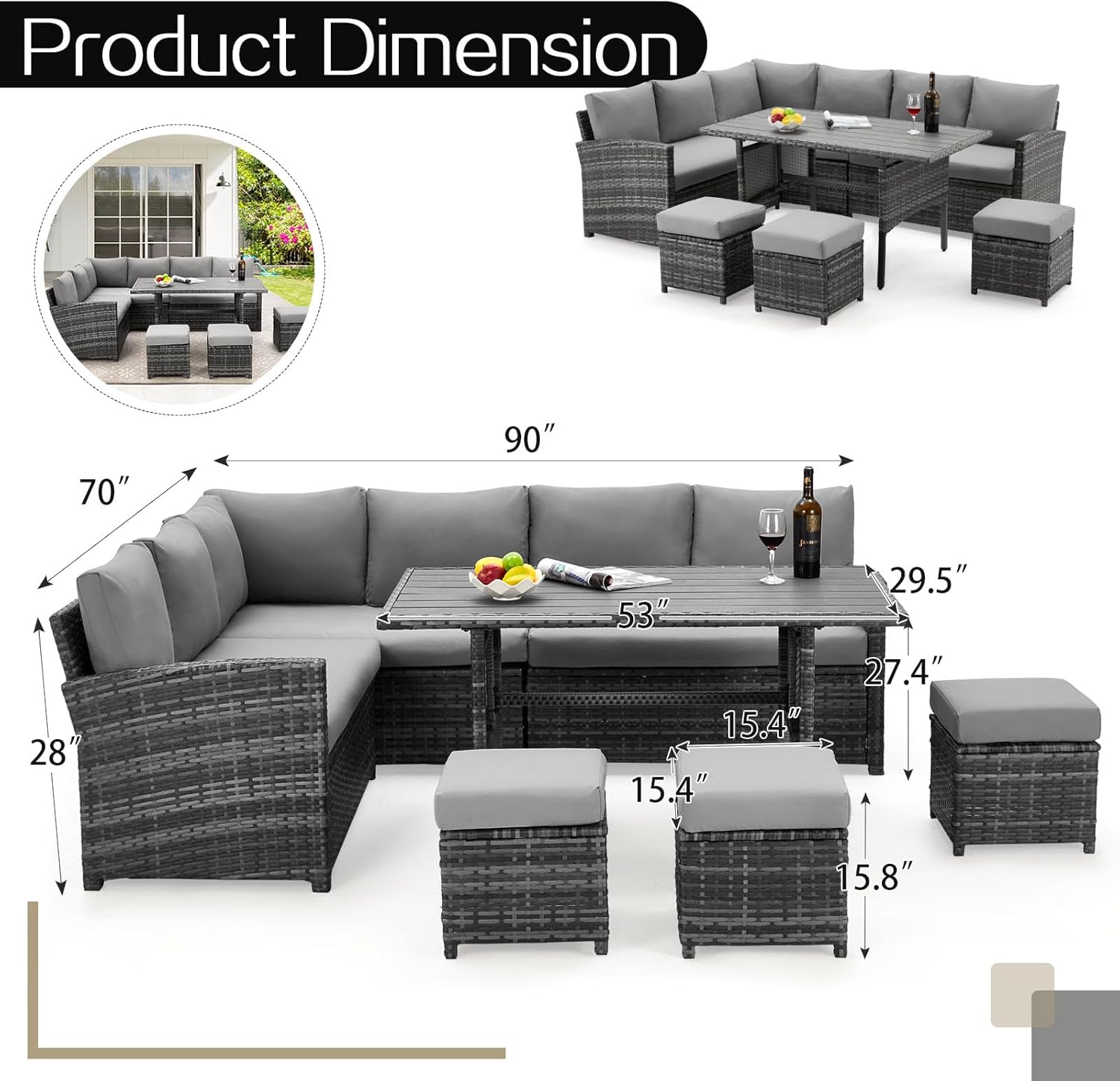 U-MAX 7 Pieces Patio Furniture Set Outdoor Sectional Sofa Conversation Set All Weather Wicker Rattan Couch Dining Table & Chair with Ottoman, Gray