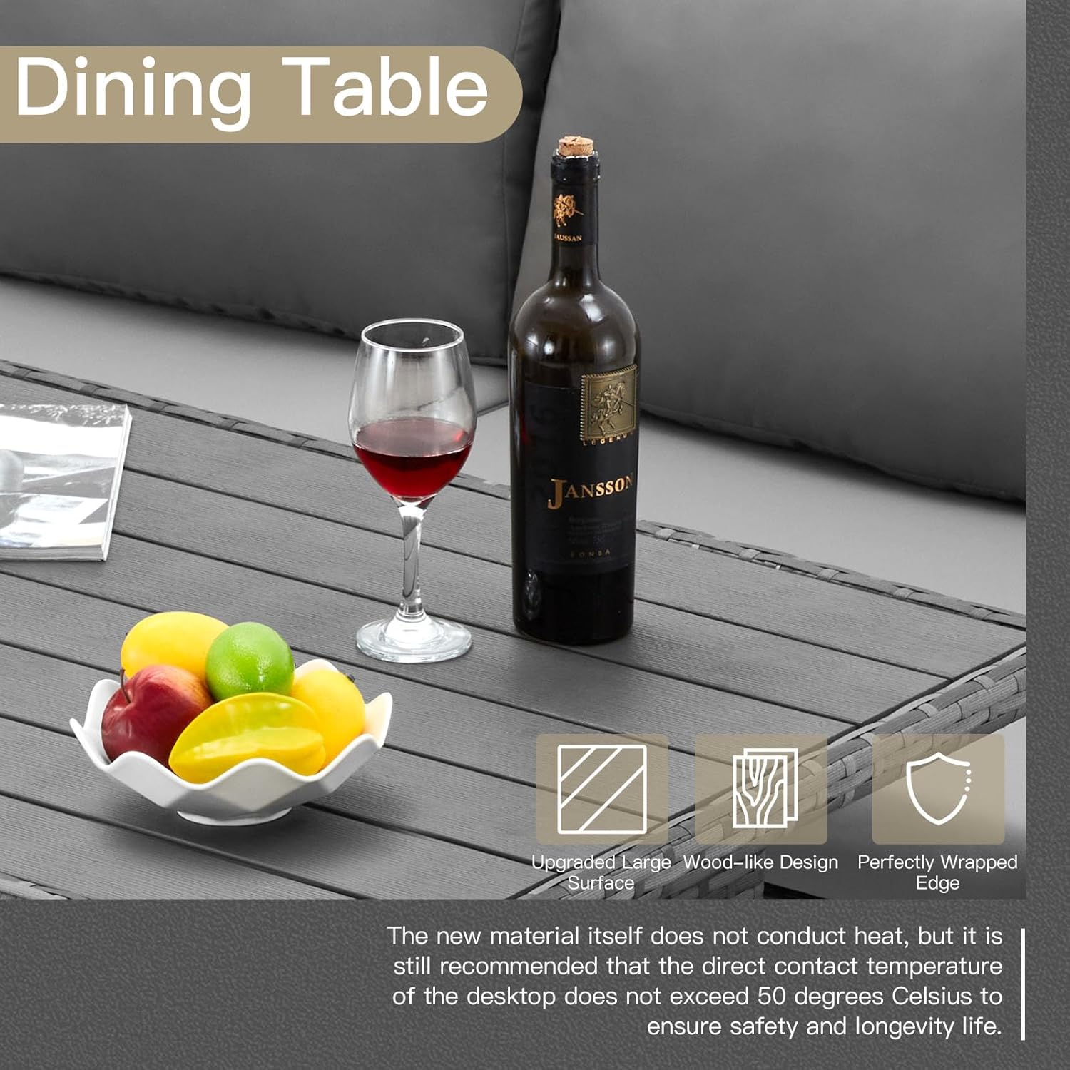 【Durable Table Top】Unique table top with wood grain adds realistic and retro style to your garden. Our upgraded wood plastic composite table top measures 54” length and 29.5” width covering a large placing area no matter gathering or dining. Table top can withstand temperature about 60-70℃. We do not recommend to place hot food on it in order to protect the top.