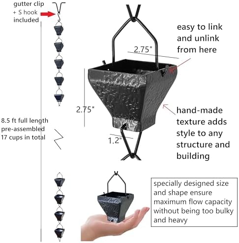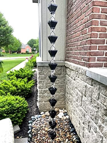 RAIN CHAINS look great work great and sound great! No more boring downspouts! Install one of these at your front porch or backyard for added curb appeal. This rain chain features contemporary textured square cup, black powder coated, heavy duty metal and detail oriented craftsmanship.