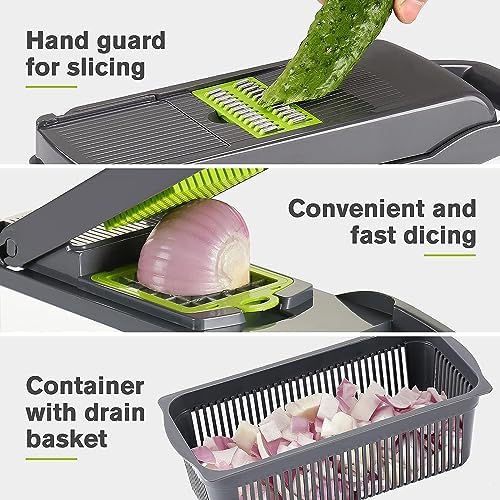 Upgraded onion chopper: A large capacity container at the bottom with a water filtering basket, this allows you to clean vegetables and fruits directly after cutting and slicing, then drain excess water.
