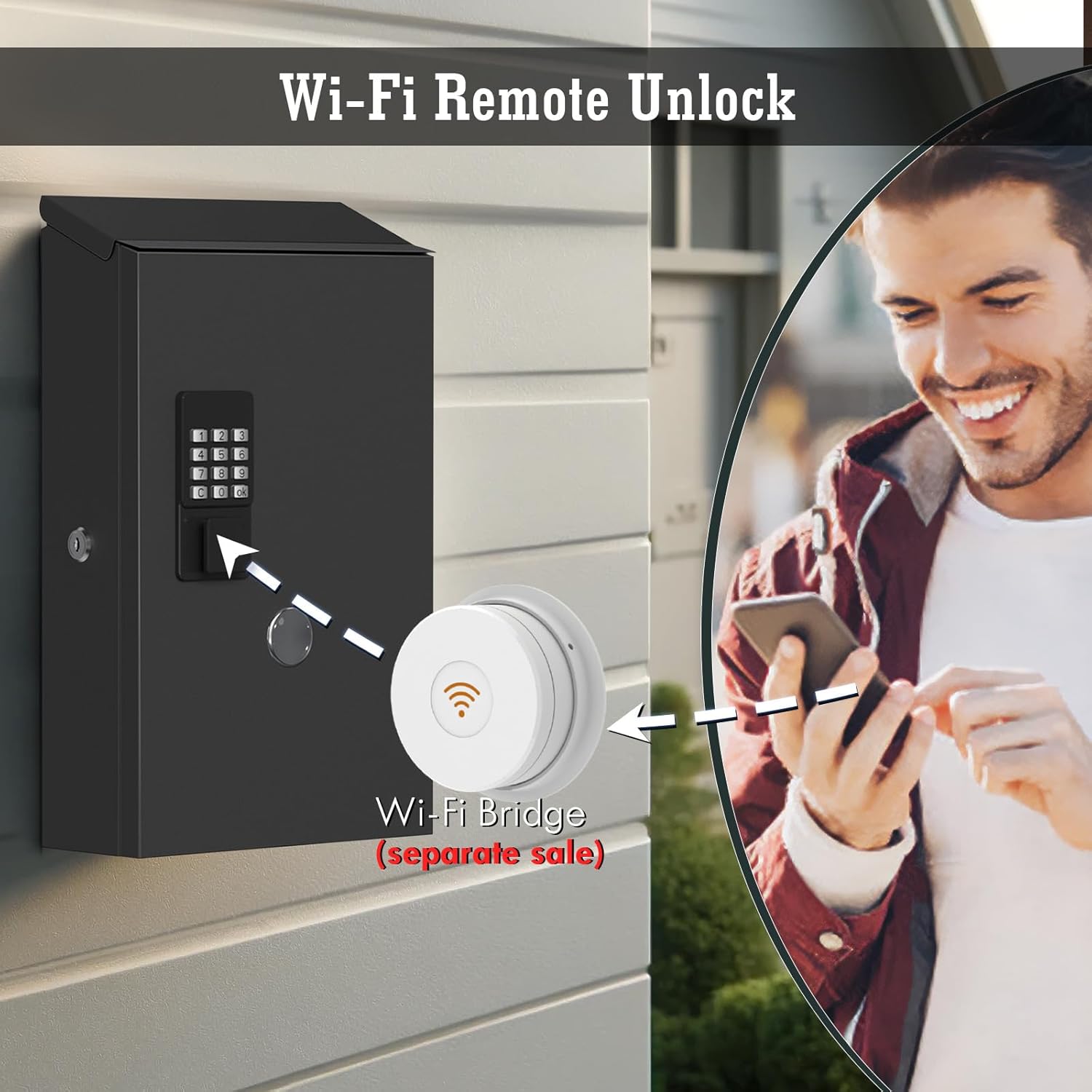 2-in-1 Mailbox: Streamline your daily routine with our multifunctional mailbox and key box combo. Retrieve your mail and keys with just one easy access, eliminating the hassle of managing multiple boxes.2,Phone Bluetooth unlocking, which requires the installation of the WeHere App to use. 3,Wi-Fi remote unlocking, which requires the separate purchase of the WeHere (W100) gateway. 4,Backup key unlocking, for which we provide two keys.