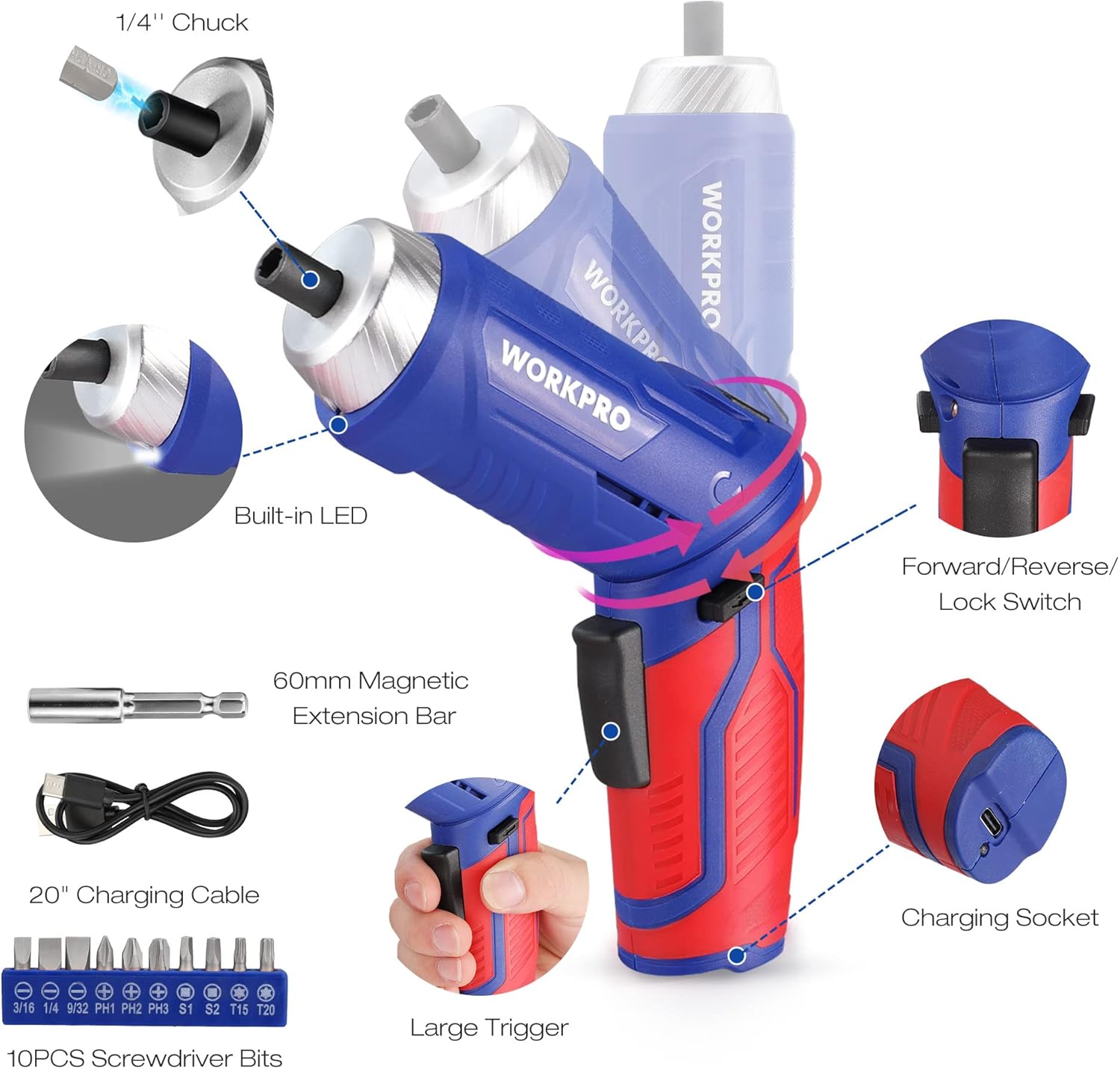 WORKPRO Home Tool Kit with 3.7V Rotatable Electric Screwdriver, 18PCS General Household Tool Kit with Toolbox, Rechargeable Electric Screwdriver Kit, Basic Portable Tool Set for Dorm, Garage, DIY